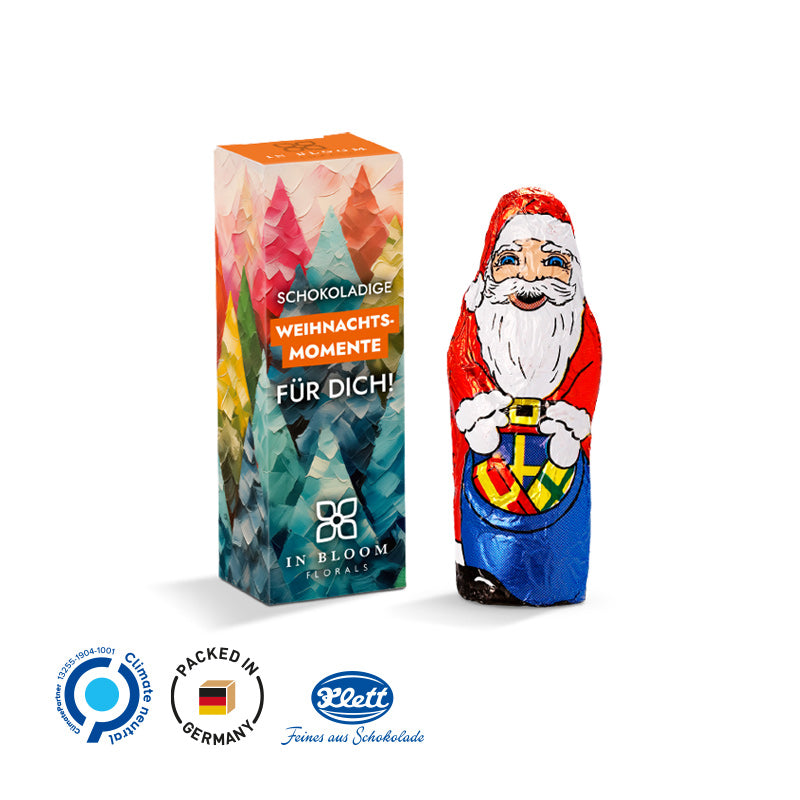 Der Klett Schoko-Weihnachtsmann in der individuell gestaltbaren Werbekartonage ist ein purer Genuss aus feinster Vollmilchschokolade. Mit einem Gewicht von 15 g ist er die ideale Aufmerksamkeit in der Weihnachtszeit. Die weiße Werbebox bietet viel Platz für dein Logo oder Wunschdesign, das im hochwertigen 4c Euroskala Druckverfahren aufgebracht wird. Hergestellt in Europa, punktet der Schoko-Weihnachtsmann nicht nur mit Qualität, sondern auch mit seiner nachhaltigen Verpackung aus FSC-zertifiziertem Karton. Zudem handelt es sich um ein klimaneutrales Produkt, das perfekt für umweltbewusste Unternehmen geeignet ist. Bedrucke deinen Schokoladen Weihnachtsmann mit deinem Logo und verschenke Freude diese Weihnachten.