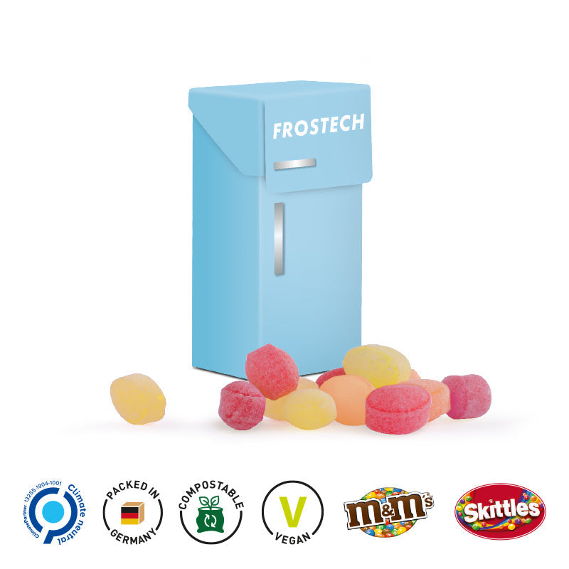 Kleine Box, großer Werbeerfolg: Die kleine, elegante Slim Box Mini überzeugt mit genügend Platz für eine individuelle Werbebotschaft und sorgt mit den leckeren Micro Bonbons für unvergessliche Genussmomente. Der Clou: Dank dem Klick-Verschluss lässt sich die Box schnell öffnen und schließen. So, ist die Box ein perfektes Giveaway für Unterwegs und passt perfekt in jede Hosentasche. Box mit "Klick-Verschluss" aus weißem Karton in kompostierbarer Frischeversiegelung mit verschiedenen Füllvarianten, klimaneutral.
