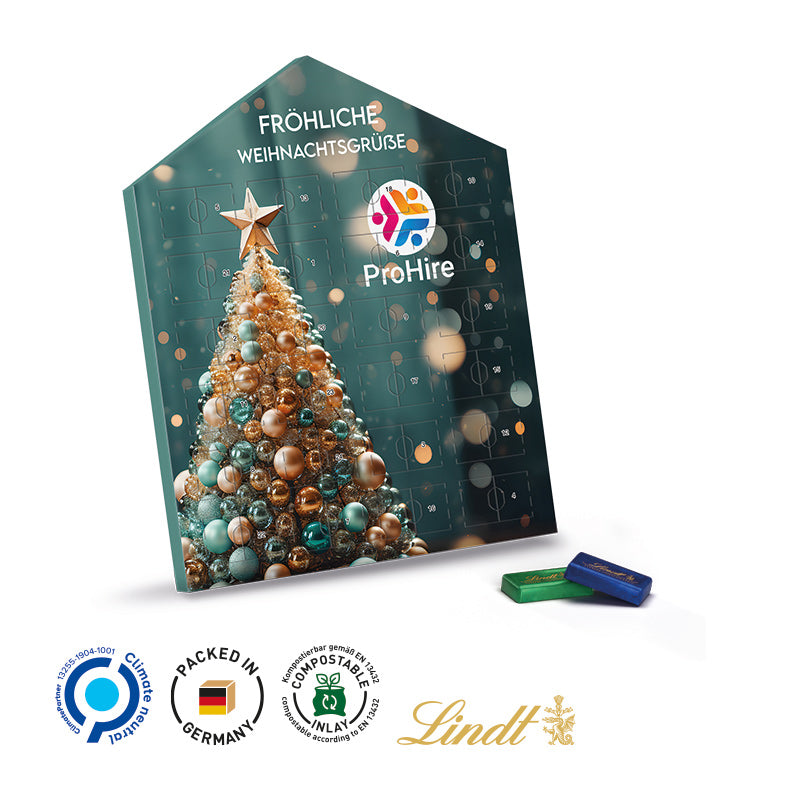 Der bedruckbare Täfelchen Adventskalender im Haus-Design ist eine originelle und aufmerksamkeitsstarke Geschenkidee für die Weihnachtszeit. Mit einem ausklappbaren Tischaufsteller und einem praktischen Aufhänger auf der Rückseite kann der Kalender vielseitig platziert werden. Das kompostierbare Inlay macht ihn besonders umweltfreundlich. Der Kalender wird im 4c Euroskala Druckverfahren auf einem FSC-zertifizierten Karton produziert und ist klimaneutral, was ihn zu einer nachhaltigen und gleichzeitig festlichen Werbemöglichkeit macht. Die Füllung kann individuell gewählt werden, darunter Sarotti Schokoladen-Täfelchen, 24 Lindt Schokotäfelchen, Napolitain in Pergaminpapier oder share Napolitain. Hergestellt in Europa und bereits ab 100 Stück erhältlich, eignet sich dieser Adventskalender ideal für weihnachtliche Werbebotschaften.