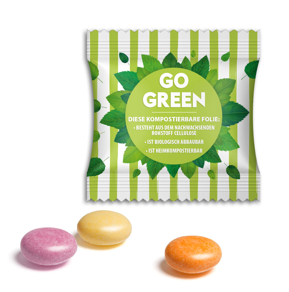 Double mentos, das vegane Kaubonbon in kompostierbarer Folie. Das komplette Tütchen kann vollflächig per Flexodruck, 4c Euroskala, mit deinem Logo oder Wunsch-Design bedruckt werden. Die Folie besteht aus nachwachsendem Rohstoff Cellulose, ist biologisch abbaubar und kann auch im Heimkompost kompostiert werden. Je Tütchen sind zwei mentos Kaubonbons in der Sorte Mint oder Fruit. Bei sachgerechter Lagerung sind sie bis zu 6 Monate haltbar. Gestalte jetzt dein leckeres Give Away!