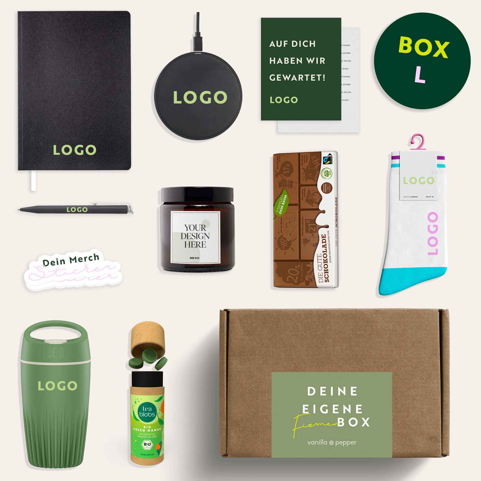 Bei einer Bestellmenge von 50 Stück enthält die Box zusätzlich zwei Bio-Kugelschreiber, die in den Farben dunkelblau, hellgrün, schwarz oder weiß erhältlich sind und personalisiert werden können. Die Geschenkbox enthält außerdem eine individuell bedruckte Postkarte im A6-Format, die mit einem 4c-Druck versehen wird, sowie einen Sticker im Format 5 x 5 cm, ebenfalls mit einem 4c-Druck.