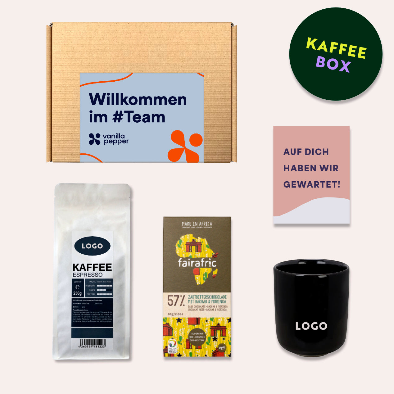 Überrasche deine Mitarbeiterinnen oder Kundinnen mit einem kleinen Mitarbeitergeschenk: der Kaffee Box. Dieses nachhaltige Werbegeschenk richtet sich speziell an Kaffeeliebhaber*innen und vereint hochwertige Werbeartikel, die ideal für Marketing-Zwecke geeignet sind. Jede Box enthält eine individuell gestaltete Postkarte, die du mit deinem Logo oder einer persönlichen Nachricht versehen kannst, um eine einzigartige Verbindung zu schaffen.