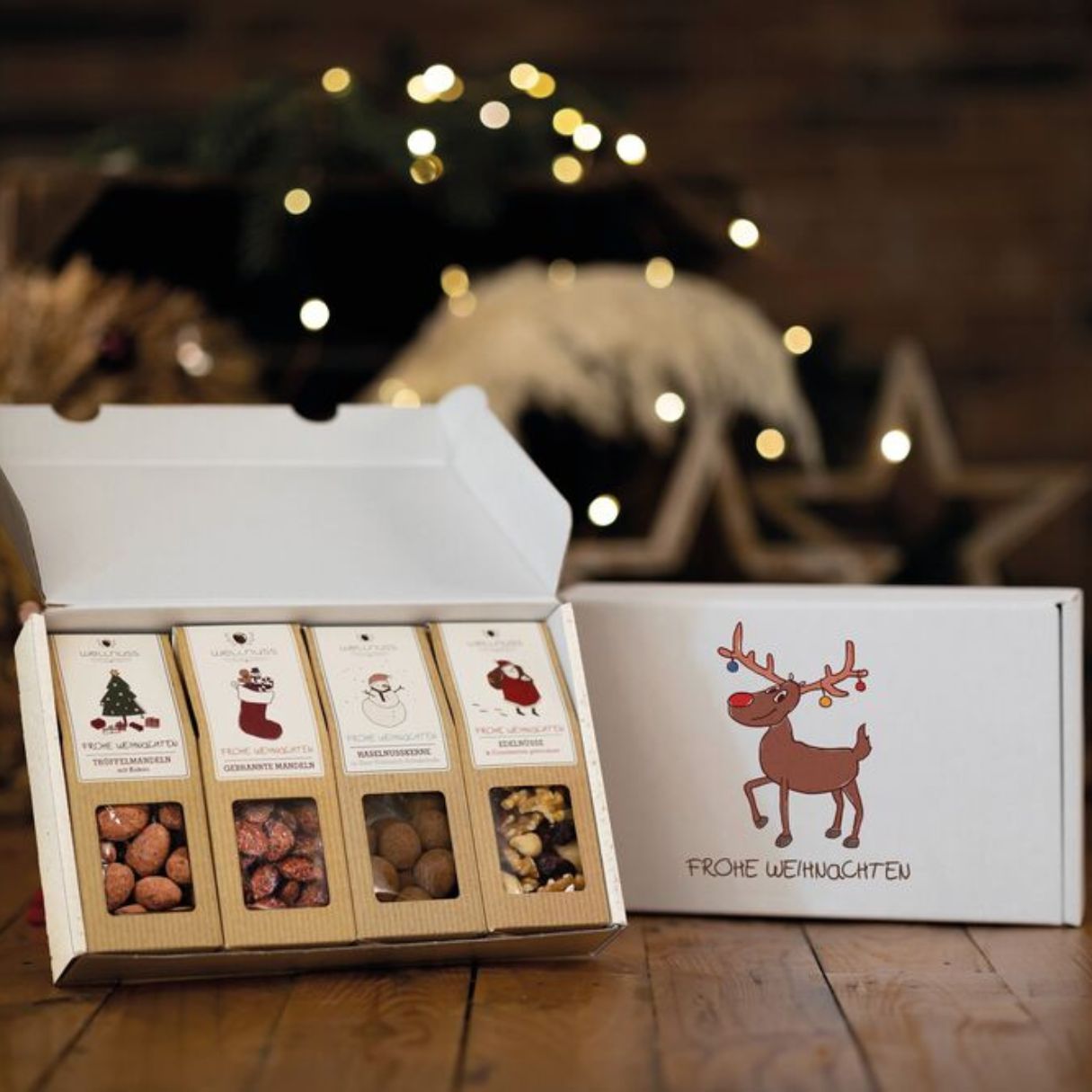 Der Faltkarton ist perfekt geeignet, um Kund:innen und Mitarbeiter:innen eine Freude zur Weihnachtszeit zu verschenken.