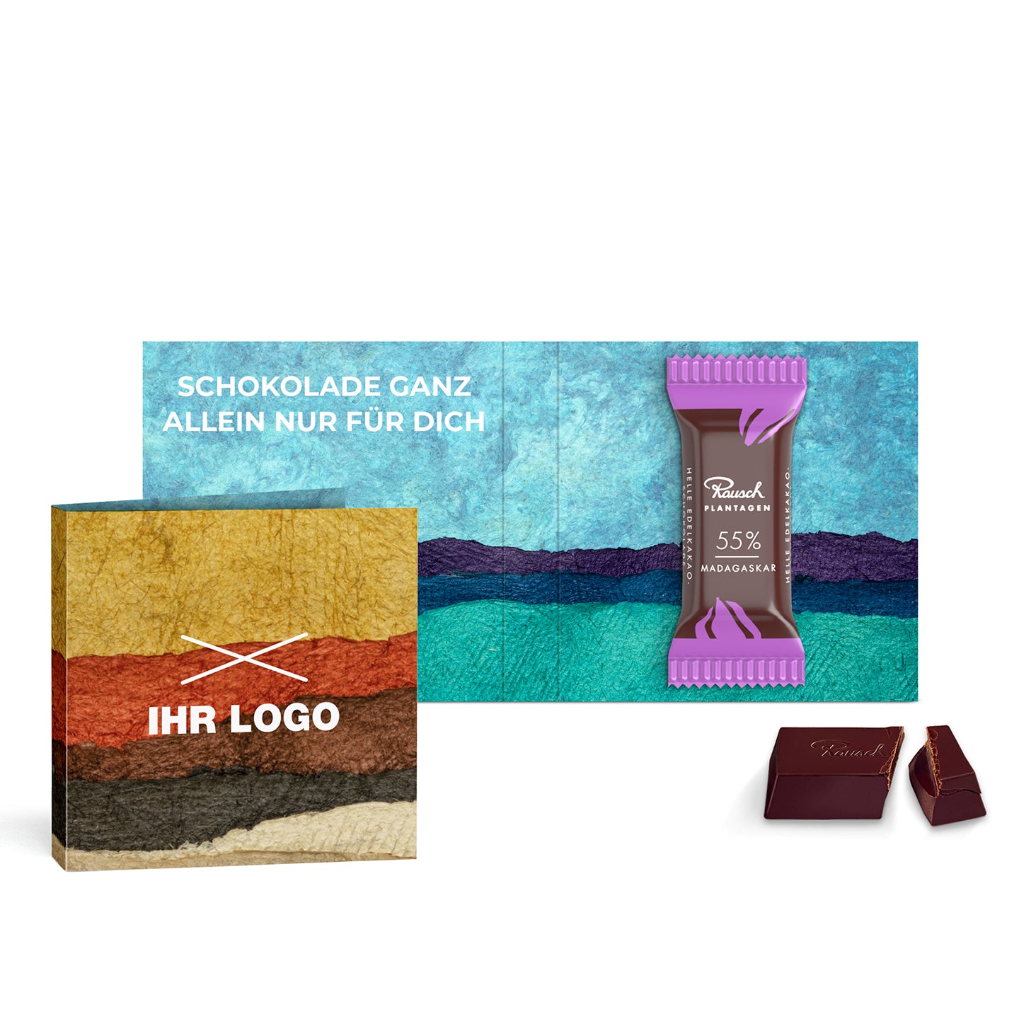 Die Rausch Plantagen Minis in der kleinen Klappkarte bieten schokoladige Freude und besondere Genussmomente zu Weihnachten. Mit einer Auswahl aus drei edlen Schokoladensorten, die von 43% Kakao aus Venezuela, über 39% Kakao aus Grenada, bis hin zu 60% Kakao aus Peru reichen, verschenkst du eine hochwertige Vielfalt an Schokolade, die jedem Gaumen schmeichelt. Die Klappkarte, in der die Schokolade verpackt ist, kann im 4c Euroskala Druck individuell gestaltet werden, sodass dein Logo und deine Botschaft stilvoll zur Geltung kommen.