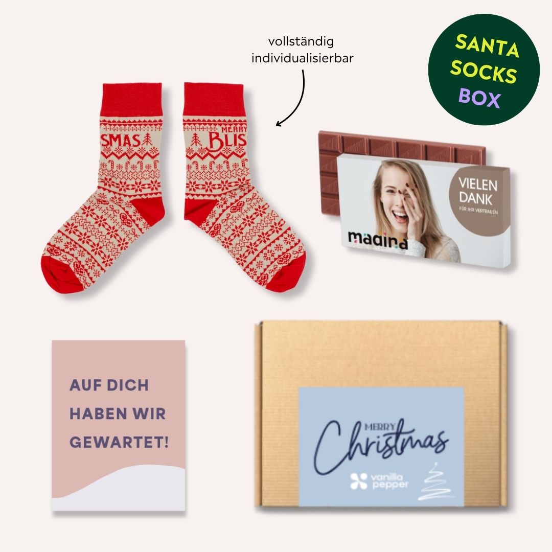 Die Santa Socks Box ist das perfekte Geschenk für die Weihnachtszeit und ideal als Nikolausgeschenk für Unternehmen, die ihren MitarbeiterInnen oder KundInnen eine süße Überraschung und ein kuscheliges Highlight bieten möchten. Diese durchdachte Geschenkbox kombiniert Genuss und Komfort und lässt sich nach deinen Vorstellungen individuell gestalten, um ein unvergessliches Geschenk zu schaffen. Die Box enthält eine individuelle Grußkarte, die eine persönliche Nachricht bietet und mit deinem Firmenlogo oder einer speziellen Weihnachtsbotschaft bedruckt werden kann. Zudem enthält sie bedruckte Socken in deinem Design, die ein warmes und gemütliches Highlight der Santa Socks Box darstellen. Diese Socken können mit dem Firmenlogo, einem weihnachtlichen Motiv oder einer anderen kreativen Gestaltung versehen werden und bieten somit nicht nur Komfort in der kalten Jahreszeit, sondern sind auch ein praktisches und stylishes Accessoire, das gerne getragen wird.