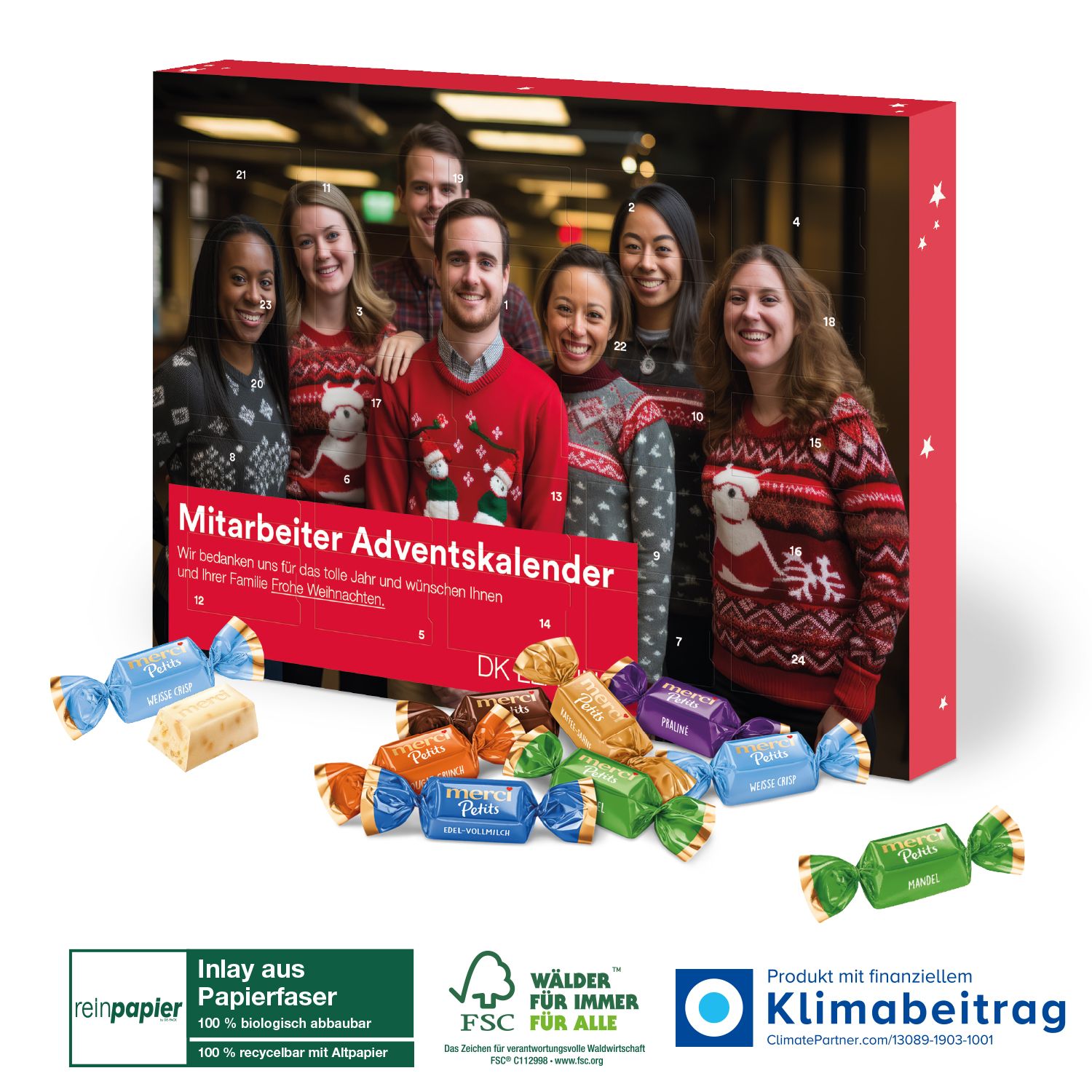 Zusätzlich besteht die Möglichkeit, einen Einzelversandkarton für den Postversand zu bestellen, um eine sichere Lieferung zu gewährleisten. Der Adventskalender mit Merci Petits ist somit eine ideale, süße Überraschung für Deine KundInnen oder MitarbeiterInnen und vereint Genuss mit umweltbewusstem Handeln in der festlichen Weihnachtszeit. Verschenke Freude und Nachhaltigkeit!