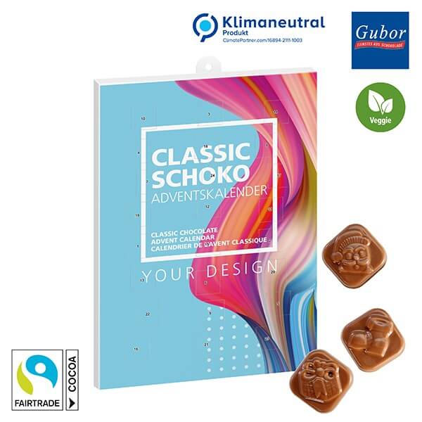 Die Weihnachtszeit versüßen mit dem Classic Adventskalender. 24 Tage eine Freude an Kund*Innen und Mitarbeiter*Innen verschenken mit der Fairtrade Schokolade von Gubor. Der Adventskalender ist im FSC-zertifiziertem Karton verpackt. Der Adventskalender gibt dir mit dem 4-farbigem Digitaldruck deinen Vorstellungen Platz die Vorderseite nach deinen Wünschen zu bedrucken. In Deutschland hergestellt. Im Quer- oder Hochformat möglich. 24 Tage präsent werben mit dem Classic Adventskalender.