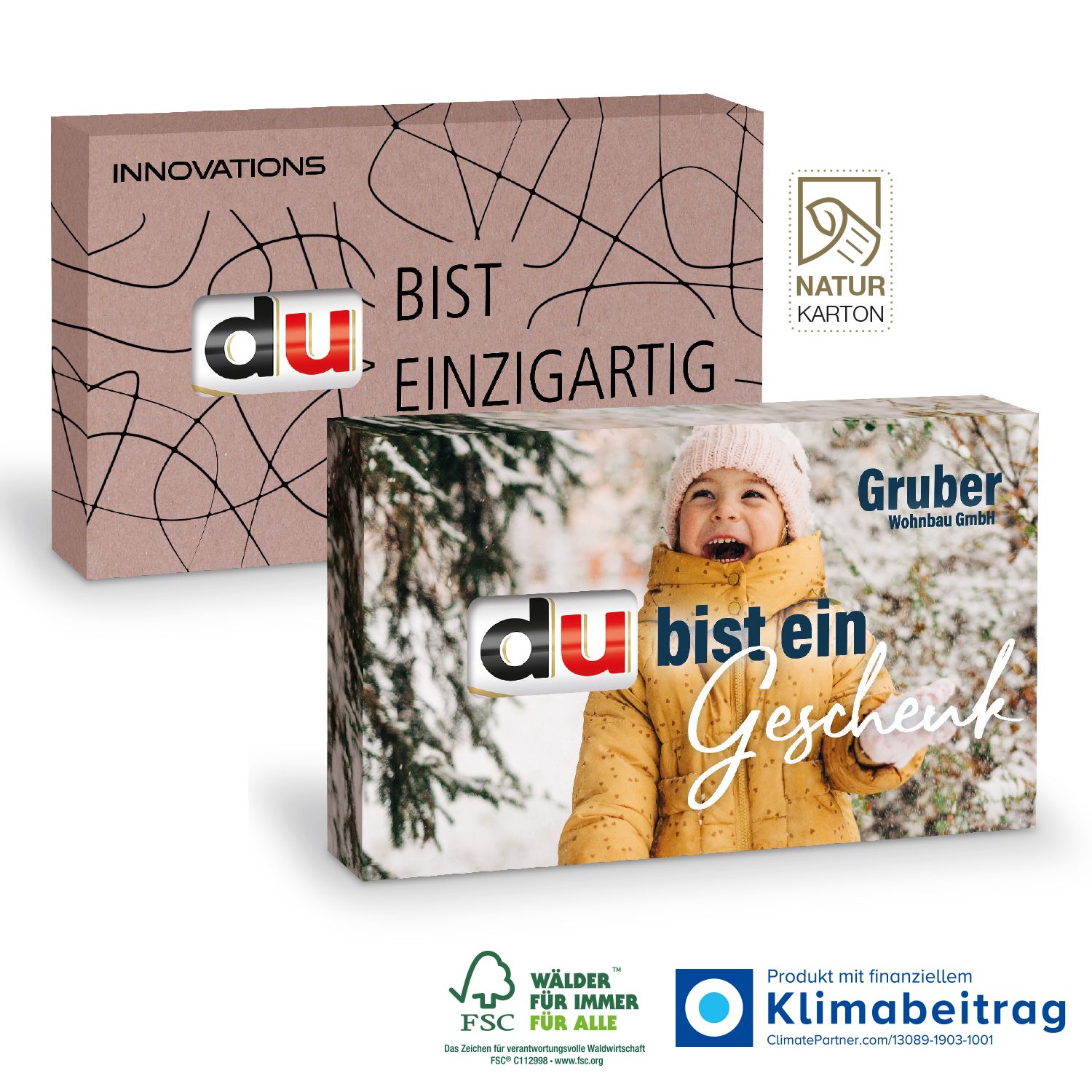 Jeder Riegel ist in einer individuellen Werbekartonage verpackt, die nicht nur frisch bleibt, sondern auch perfekt für Werbezwecke geeignet ist. Die Verpackung besteht aus FSC®-zertifiziertem Karton, was bedeutet, dass sie umweltfreundlich und nachhaltig ist.