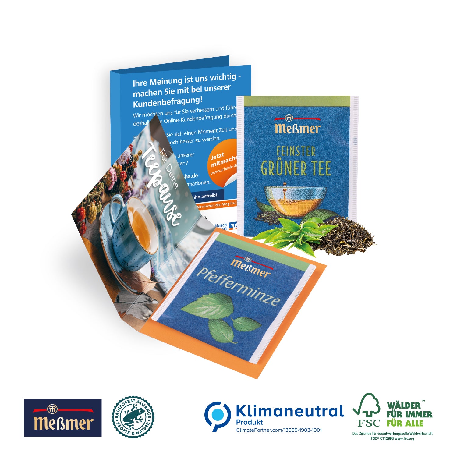Die FSC-Werbekarte mit Tee bietet nicht nur visuelle Ansprechbarkeit, sondern auch Geschmackserlebnisse. Wähle aus 5 erlesenen Teesorten von Meßmer, darunter die Früchte-Mischung, Entspannung, Pfefferminze, Klassik oder der Grüne Tee. Diese Auswahl ermöglicht es dir, die Karte für verschiedene Zielgruppen und Anlässe anzupassen.