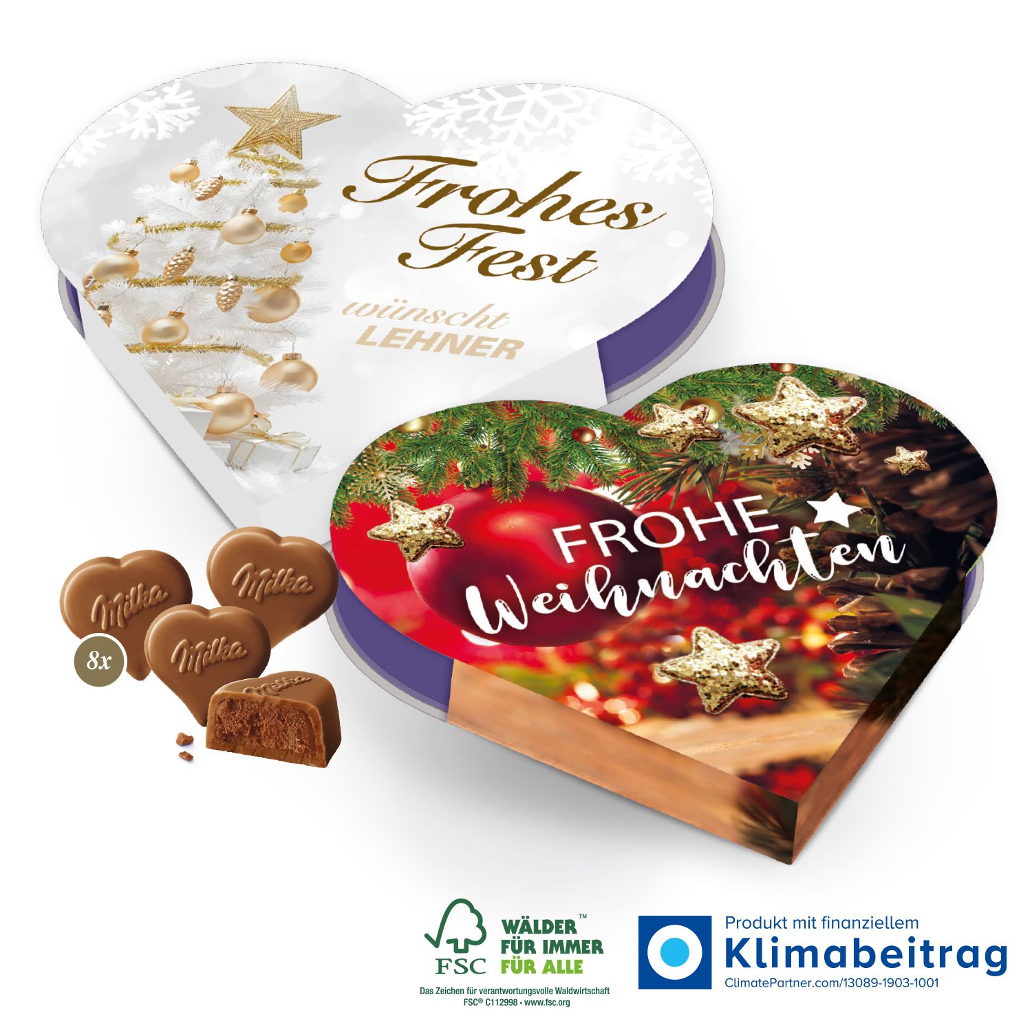 Das "I Love Milka"-Herz ist ein perfektes Dankeschön für deine MitarbeiterInnen oder KundInnen. Mit einem Gewicht von 44 g enthält es acht köstliche Milka Pralinés, die mit feiner Haselnusscrème gefüllt sind. Diese süße Überraschung kommt in einer individuellen Werbekartonage, die sich ideal für eine persönliche Note eignet.Hergestellt aus FSC®-zertifiziertem Karton, zeigt dieses Produkt auch dein Engagement für Nachhaltigkeit. Der 4c Digitaldruck sorgt dafür, dass dein Design lebendig und ansprechend zur Geltung kommt. Optional kann das Herz in einem Einzelversandkarton für den Postversand geliefert werden, was es zu einem praktischen und durchdachten Geschenk für die Weihnachtszeit macht!