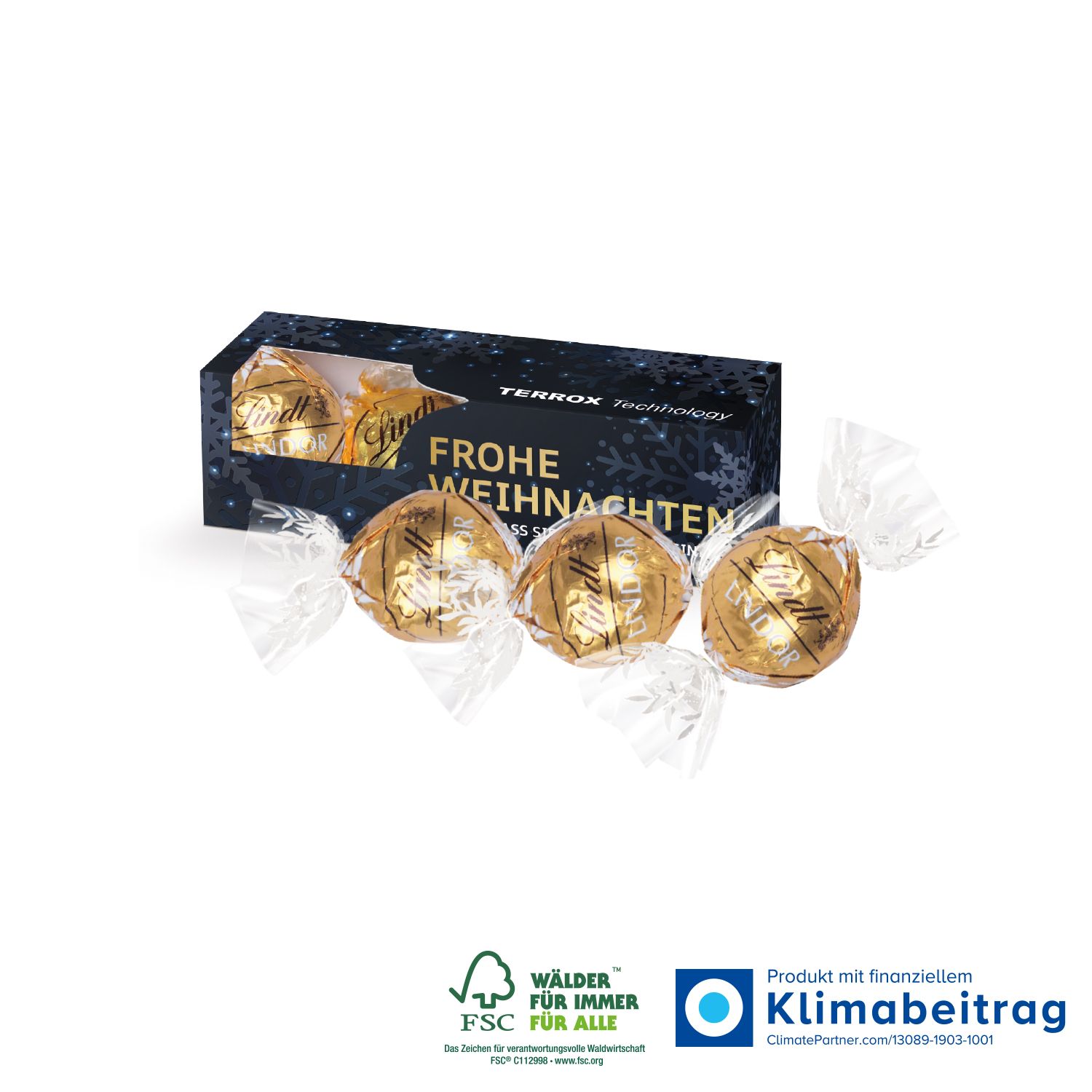 Das Lindt Lindor Präsent 3er ist die perfekte Mischung aus Liebe und Leidenschaft für Schokolade, ideal als Werbegeschenk. Es enthält drei köstliche Lindor Pralinés mit einem Gesamtgewicht von ca. 36 g, die in bunten Geschmacksrichtungen angeboten werden. Auf Wunsch sind die Pralinés auch sortenrein erhältlich, sodass du genau die Sorten wählen kannst, die deinen Bedürfnissen entsprechen.