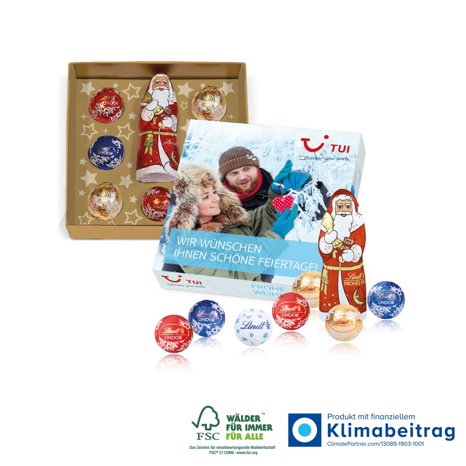 Die Lindt Schokoladenmischung in einer individuellen Werbekartonage ist das ideale Weihnachtspräsent für Mitarbeiter und KundInnen. Mit einem Gesamtgewicht von 40 g enthält die Mischung sieben bunte Lindt „Minis“ sowie einen zartschmelzenden Lindt Weihnachtsmann, der für festliche Stimmung sorgt.