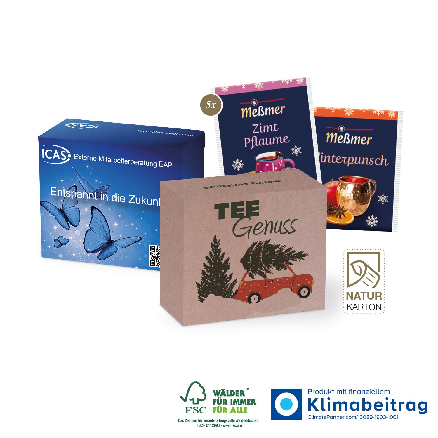 Der Premium-Tee von Meßmer in der individuell gestaltbaren Werbebox ist die perfekte Geschenkidee für alle Teeliebhaber. Die kompakte Box im Format ca. 79 x 67 x 33 mm enthält 5 einzeln verpackte Teebeutel in Aromaschutzfolie – für frischen und intensiven Genuss bei jeder Tasse.