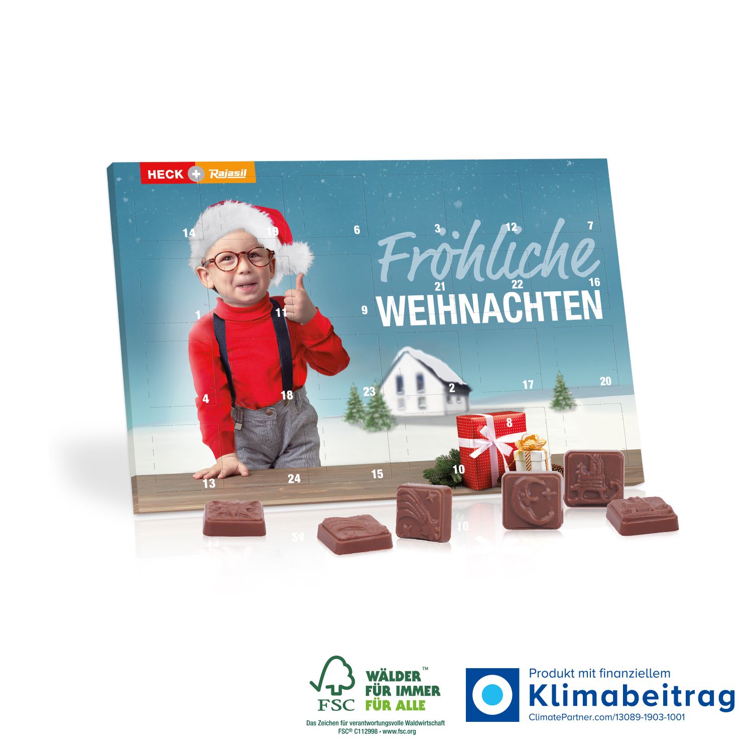 Der Tisch-Adventskalender „Classic Exklusiv“ bringt 24 Tage lang festliche Freude und Werbepräsenz auf deinen Tisch! Er enthält 24 köstliche Stücke (ca. 75 g) Vollmilchschokolade in Confiserie-Qualität, die Rainforest Alliance-zertifiziert sind. Mit einer praktischen Vollkartonhülle im Querformat und einem stabilen Tischaufsteller zum Ausklappen ist dieser Kalender nicht nur ein echter Blickfang, sondern auch äußerst funktional.