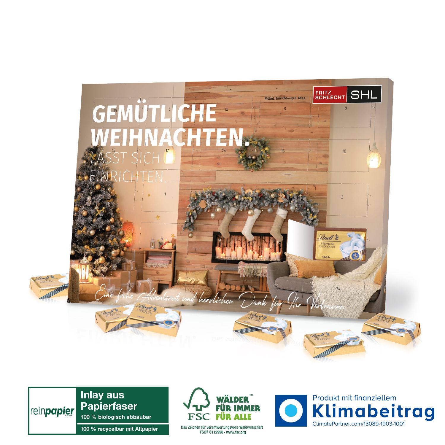Verschenke den Tisch-Adventskalender Lindt „Select Edition“ Organic und schaffe eine festliche Atmosphäre voller süßer Überraschungen, die nicht nur den Gaumen erfreuen, sondern auch das Umweltbewusstsein stärken. Ein perfektes Geschenk für KundInnen und MitarbeiterInnen, das sowohl Freude bringt als auch Verantwortung zeigt!