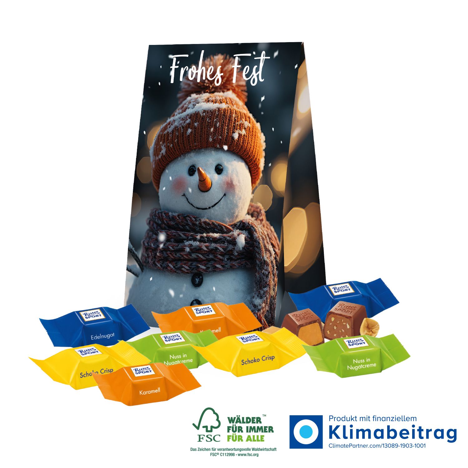 In der Tasche sind 8 köstliche Ritter SPORT Schokowürfel (ca. 64 g) in bunten Geschmacksrichtungen enthalten, die garantiert für Freude sorgen. Ob auf Messen, Veranstaltungen oder einfach als kleine Aufmerksamkeit für Kunden und Mitarbeiter – diese süße Füllung hinterlässt einen bleibenden Eindruck.
