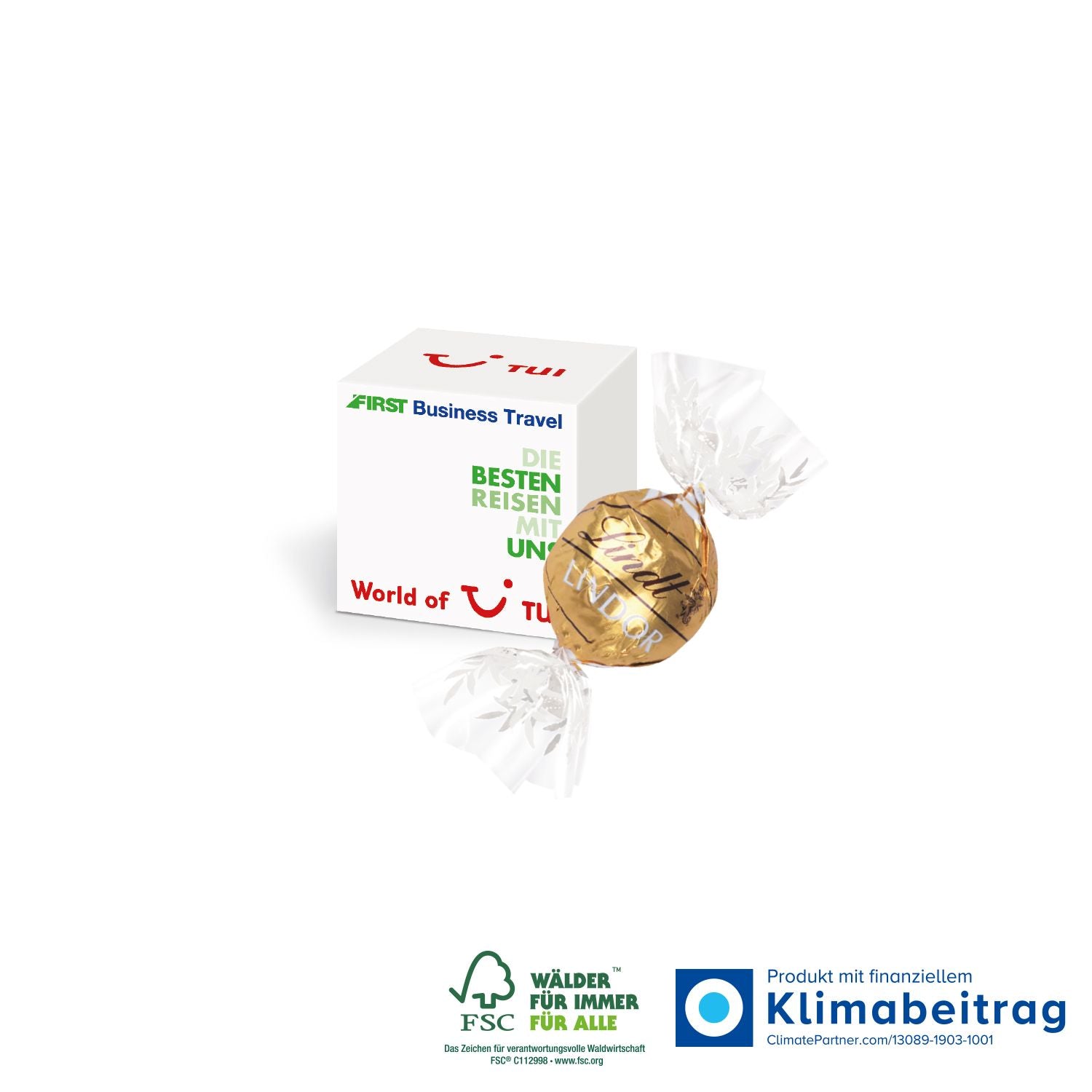 Der Werbewürfel mit Lindt Lindor Pralinés ist das perfekte Werbemittel für schokoladige Genussmomente! Dieser hochwertige Würfel aus Kartonage bietet nicht nur eine ansprechende Optik, sondern auch eine köstliche Füllung, die deine Kunden und Mitarbeiter begeistert.
