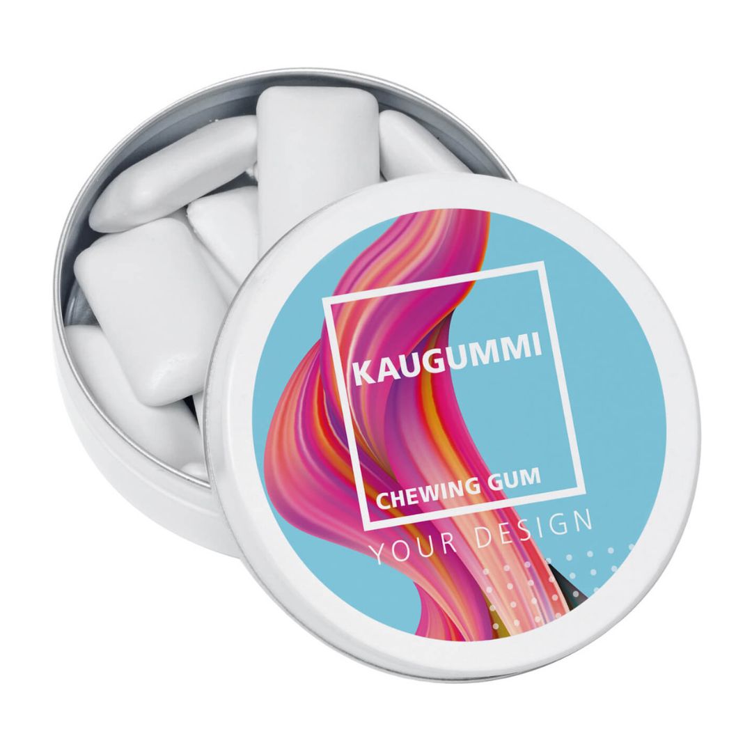 Noch schnell etwas frisches für die nächste Messe? Die Taschendose mit zuckerfreiem Kaugummi ist innerhalb von weniger als 2 Wochen bei dir! Die wiederverwendbare Taschendose aus Weißblech ist mit Süßigkeiten gefüllt und hat dabei die ideale Größe für unterwegs. Die Dose ist recycelbar und kann mit drei Sorten von Bonbons gefüllt werden. Der Deckel der Taschendose ist mit deinem 4-farbigen Digitaldruck bedruckt. Made in Germany. Überzeuge dich und deine Kund*Innen mit der XS-Taschendose mit Kaugummi.