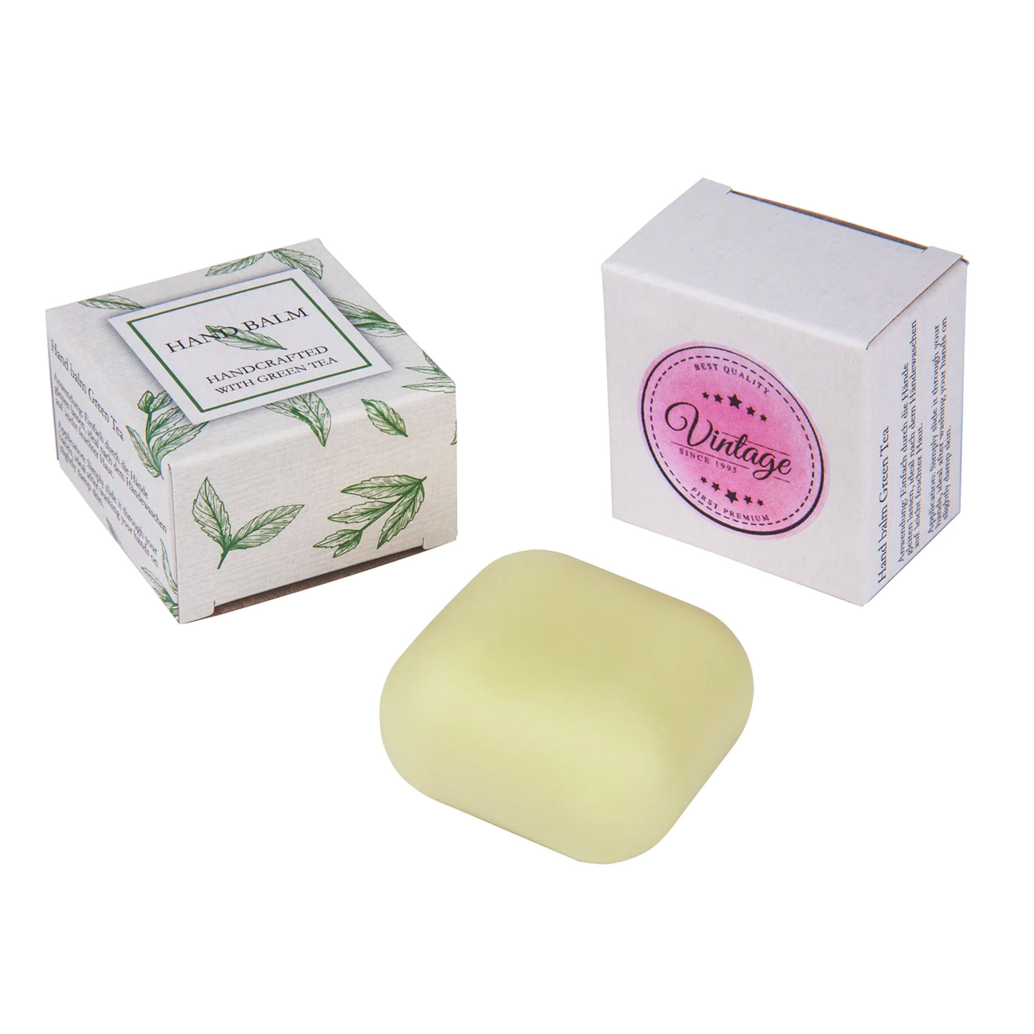 Die feste Handcreme ist die nachhaltige Alternative zur Handcreme in Plastikflaschen. Perfektes Werbemittel für neue Kund*Innen im Hotel. Die Handpflege verwöhnt die Hände mit Sheabutter und Olivenöl. Intensive und langanhaltende Pflege mit leichtem Grüntee Aroma für die Hände. Einfach durch die leicht feuchten Hände gleiten lassen und die Handpflege genießen. Bedrucke die Faltschachtel in deinem Design.