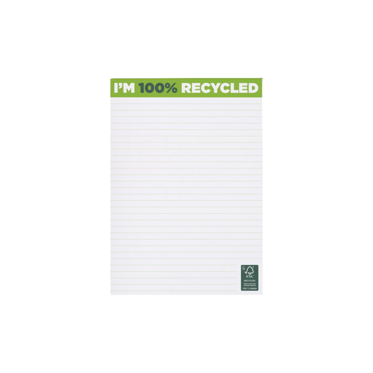 Der Notizblock besteht aus recyceltem Papier mit einem Gewicht von 80 g/m2, was nicht nur die Umwelt schont, sondern auch ein angenehmes Schreiberlebnis ermöglicht. Der Deckel des Blocks ist aus Recyclingkarton mit einem Gewicht von 280 g/m2 gefertigt, was für zusätzliche Stabilität sorgt.