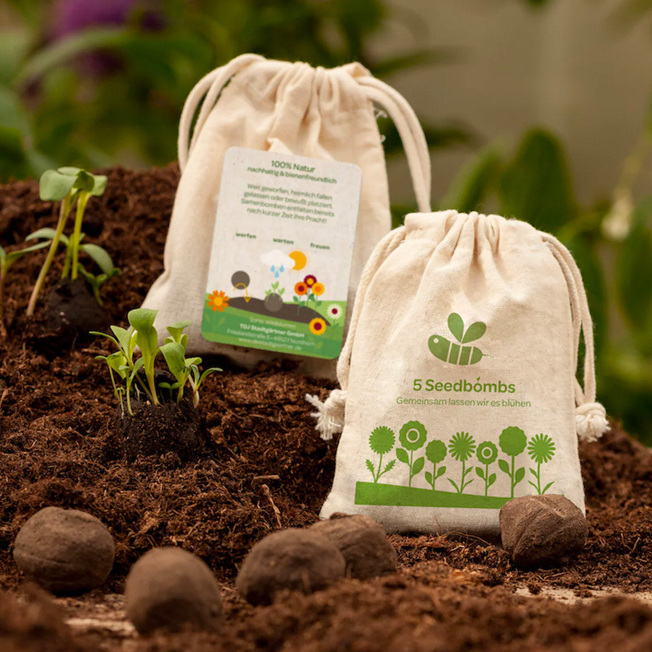 Verschenke ein langlebiges Werbegeschenk mit dem 5er Jutebeutel. Es bleibt eine Überraschung, welche Blume wächst und bereitet eine Freude, die langerhaltend bleibt. Es befinden sich 5 Samenbomben im Beutel. Bedrucke die Baumwolltasche von vorne in der Maße 7 x 8 cm und das zusätzlich angebrachte Schild aus Recyclingpapier in der Größe 5 x 7 cm. Damit hast du eine Menge Platz deine Werbebotschaft zu vermitteln. Der Druck erfolgt als Siebdruck. Gestalte jetzt deine Jutebeutel ganz individuell.