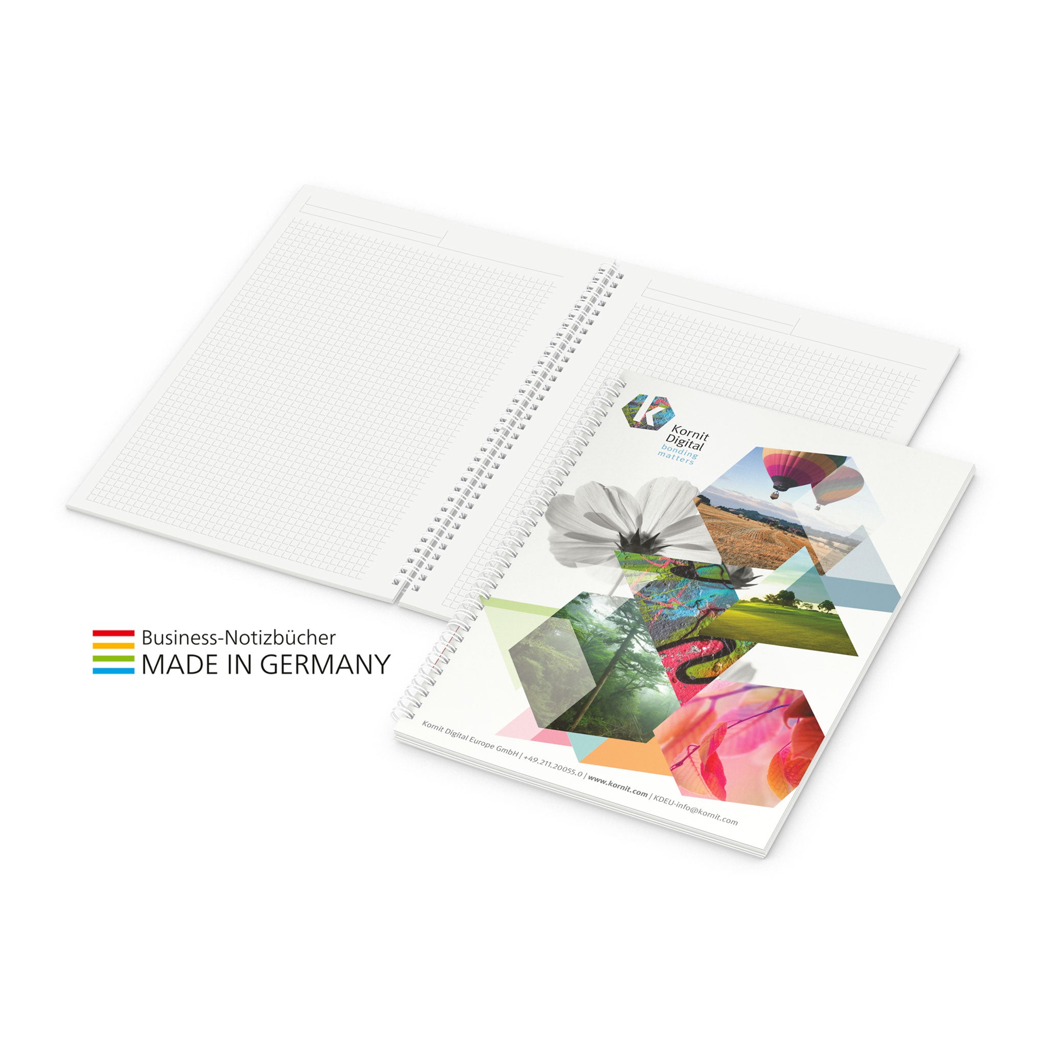 Der College Block mit individuellem Coverdruck. Der Ring Notizbuch aus Recyclingpapier ist für Konferenzen geeignet. Durch die Mikroperforation sind die Blätter besonders leicht zum Abtrennen. Die Wire-O-Bindung vereinfacht das Durchblättern durch das Notizbuch. Das Notizbuch hat 80 karierte Seiten und spitze Ecken. Mit dem 4C Quality Digital Druck kannst du die Vorderseite individuell gestalten.