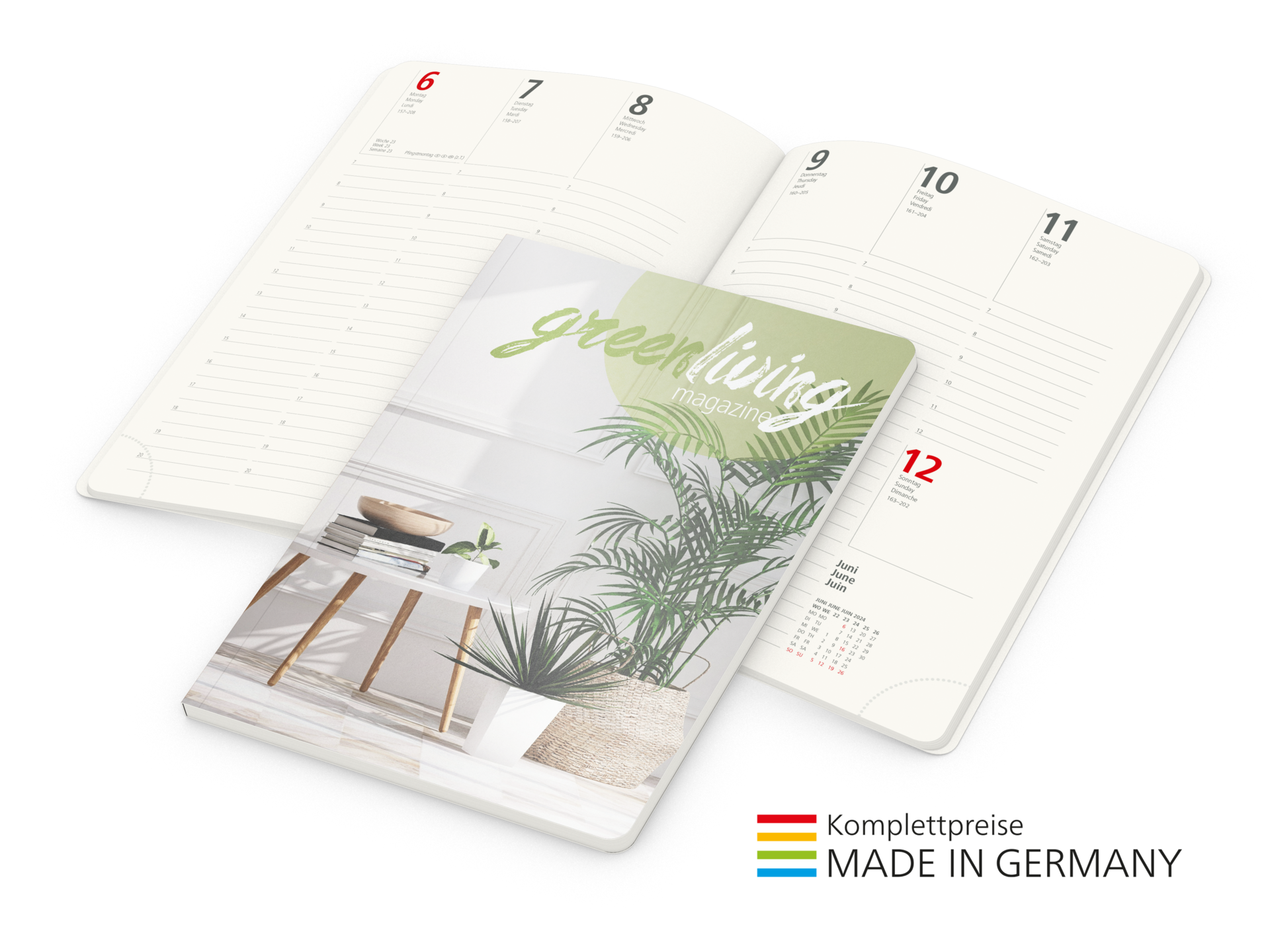 Das Einband ist individuell gestaltbar nach deinen Vorstellungen und wird per 4C-Digitaldruck veredelt. Begeistere auf Messen mit dem Softcover Taschenkalender A5 mit deinem Unternehmensdesign als Werbegeschenk.