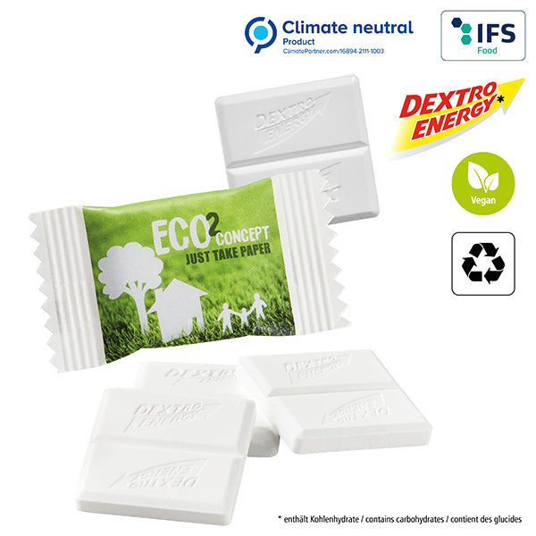 Der bekannte Energiekick für schnellen Schub. Dextro Energy im Papiertütchen, dass wieder recycelbar ist. Der Traubenzucker ist frei von tierischen Bestandteilen und somit für eine große Zielgruppe geeignet. Die Vorder- und Rückseite werden individuell mit dem 4-farbigem Digitaldruck mit deinem Design bedruckt. In Deutschland hergestellt. Gestalte deinen Dextro Energy nachhaltig im Papiertütchen.
