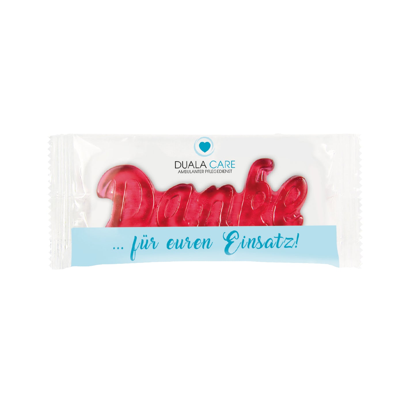 Einfach mal Danke sagen mit einem Fruchtgummi mit süßem Schriftzug. Trotz kleiner Größe voller Charme mit deinem Design bedruckt. Fruchtgummi von der Marke Trolli. Liebevoller und günstiger Streuartikel, ideal für alle Arten von Events. Nachhaltiges Give Away aus kompostierbarer Folie und klimaneutral hergestellt.