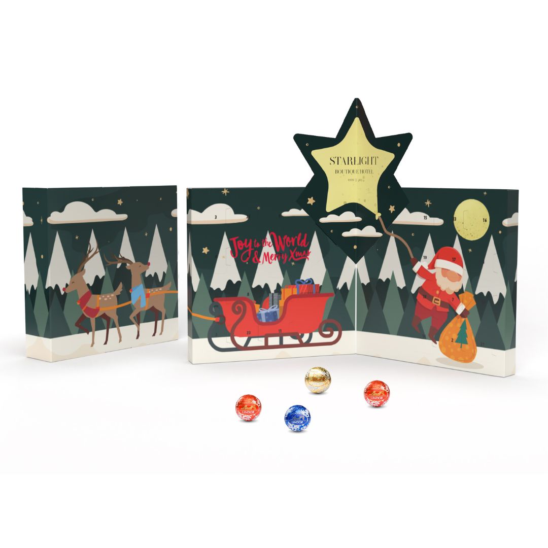 Der Lindt Adventskalender Buch Pop-Up Eco ist eine stilvolle und nachhaltige Möglichkeit, dein Unternehmen zur Weihnachtszeit kreativ zu präsentieren. Dieser besondere Adventskalender in Form eines aufklappbaren Buches bietet nicht nur eine festliche Überraschung, sondern auch ein visuelles Highlight durch seine Pop-Up-Form, die ab einer Stückzahl von 2016 individuell gestaltet werden kann. Die edlen 24 Lindt Lindor Mini Kugeln in den Geschmacksrichtungen Vollmilch, Zartbitter und weiße Schokolade sind bunt gemischt und bieten einen luxuriösen Genuss für jeden Tag im Advent.