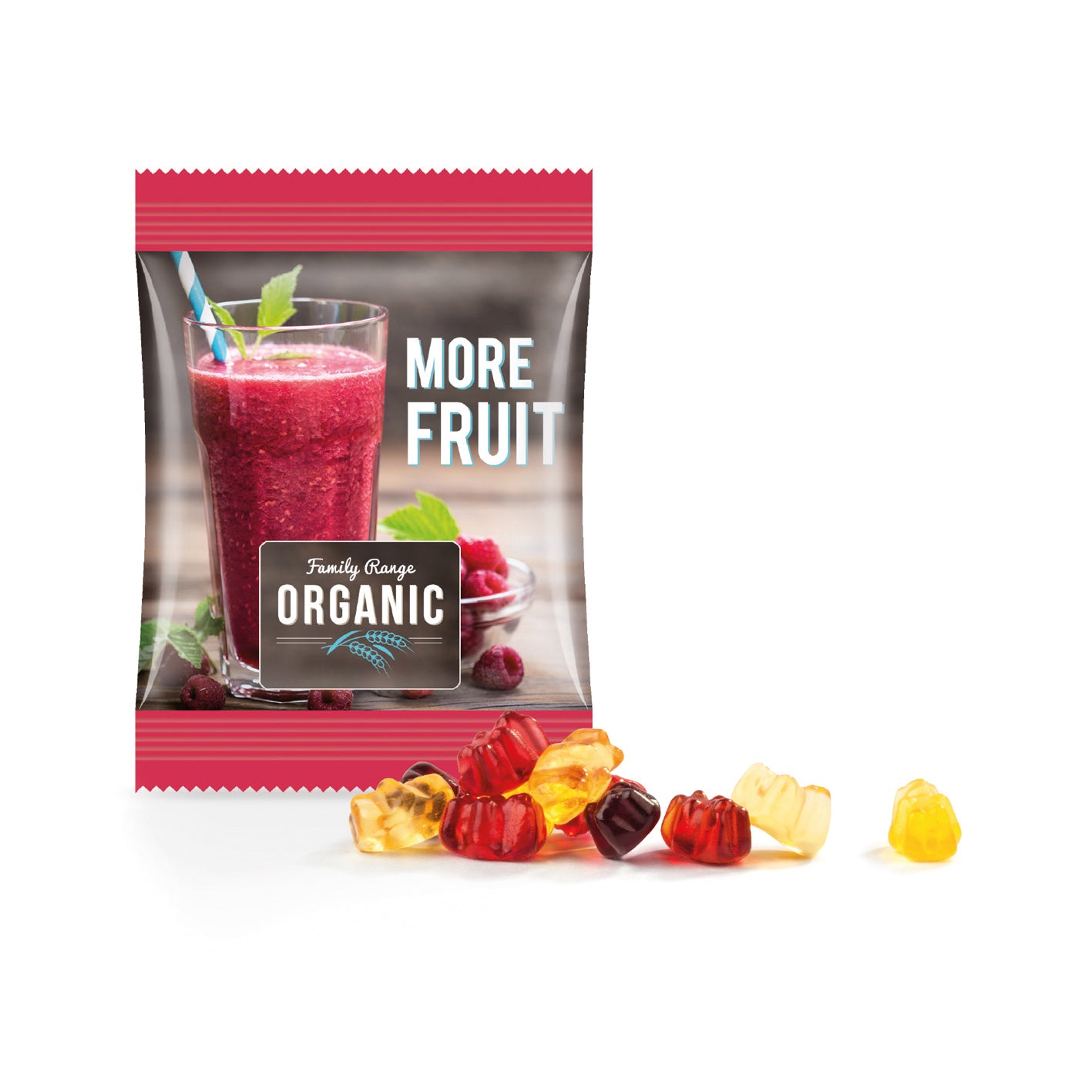 Ein Gummibärchen Tütchen ganz nach deinem Geschmack. Das Tütchen lässt sich vollflächig rundum in deinem Unternehmensdesign gestalten und bedrucken. Die Süßigkeit kommt in Fünf leckeren und fruchtigen Geschmacksrichtungen und ist von der beliebten Marke Trolli. Das Give Away ist nachhaltig aus kompostierbarer Folie und aus einer klimaneutralen Produktion.