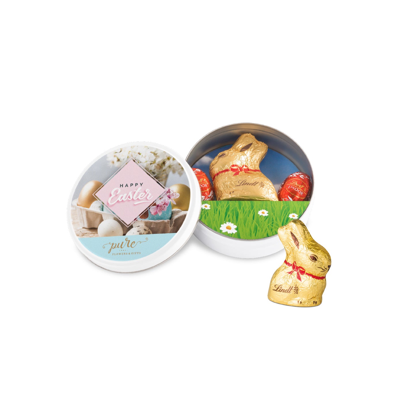 Ostern in der Dose: Mit der Oster Dose Team erhalten Sie gleich doppelt Unterstützung für Ihre Ostergrüße. Die Osterdose besteht aus 98% recycelbarem Weißblech und ist gefüllt mit Lindt Schokoladen Osterhasen aus feinster Alpenvollmilchschokolade und zwei Mini Ostereiern aus Vollmilchschokolade. Individuell bedruckt und mit österlich gestaltetem Display Einleger bietet sie das ideale Oster-Werbepräsent für deine Kund*Innen. Lindt Schokoladen Osterschokolade in runder Dose mit Stülpdeckel, weiß aus Metall, klimaneutral, individuell bedruckt. Mit österlich gestaltetem Display Einleger, Weißblech 98 % recycelbar. Nur solange der Vorrat reicht.