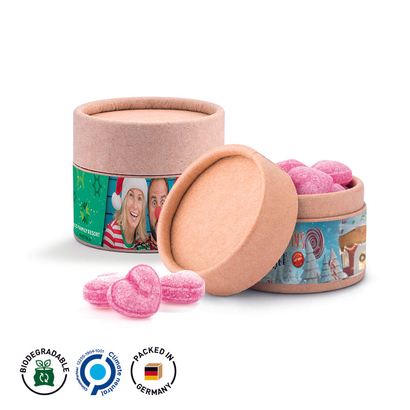 Weihnachten! Mit der Papierdose Eco Mini punkten Sie bei Ihren Kund*Innen garantiert in Sachen Nachhaltigkeit. Dank der kandierten Glühweinherzen als Weihnachtsgruß. Damit wird die kleine, biologisch abbaubare Papierdose mit ihrem rundum individuell bedruckbaren Papieretikett sicher zum ganz besonderen Werbehighlight. Umweltfreundlich werben war noch nie so einzigartig! Papierdose biologisch abbaubar aus schnell nachwachsenden Rohstoffen mit verschiedenen Füllvarianten, rundum mit Papieretikett. Mit Originalitätsverschluss. Nur solange der Vorrat reicht!
