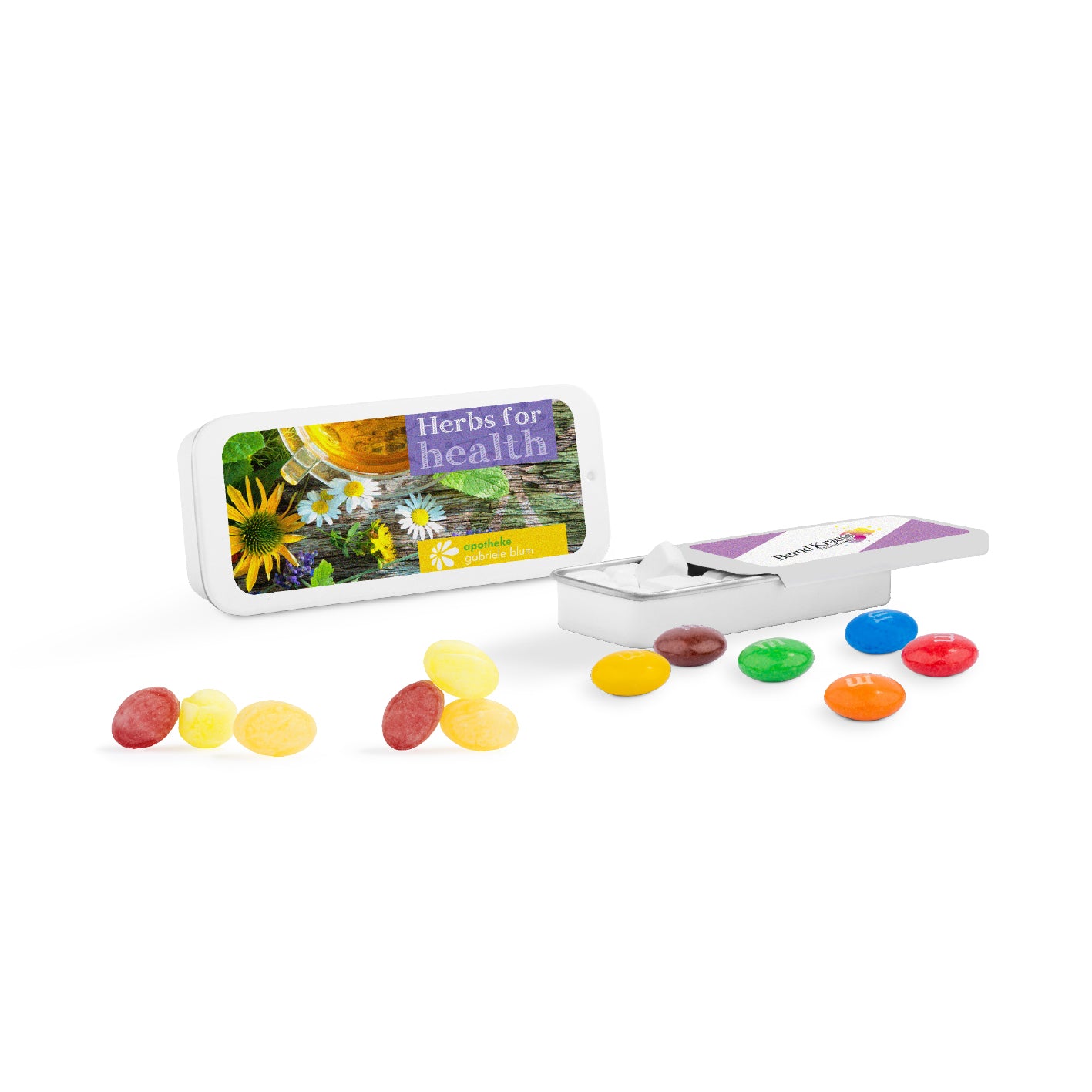 Diese weißen Schiebedeckeldosen mit eurem Logo sind die perfekten Werbegeschenke! Sie überzeugen nicht nur Mitarbeiter*Innen und Kund*Innen, sondern auch von der Nachhaltigkeit. Dank dem individuell bedruckbaren Schiebedeckel, bietet die Flat Box vielfältige Einsatzmöglichkeiten und ist so ein idealer Werbeartikel für eine gelungene Werbebotschaft. Die Schiebedeckeldosen aus recycelbarem Weißblech. Die Dose ist danach für andere Zwecke wiederverwendbar.