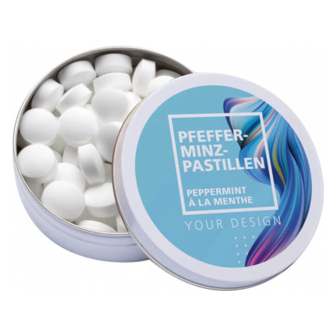 Die wiederverwendbare Taschendose aus Weißblech ist mit Süßigkeiten gefüllt und hat dabei die ideale Größe für unterwegs. Die Dose ist recycelbar und kann mit drei Sorten von Bonbons gefüllt werden. Zur Auswahl stehen Tic Tacs, zuckerfreie Pfefferminzpastillen oder die Pulmoll-Fruchtmischung. Der Deckel der Taschendose ist mit deinem 4-farbigen Digitaldruck bedruckt. In Deutschland hergestellt. Überzeuge dich und deine Kund*Innen.