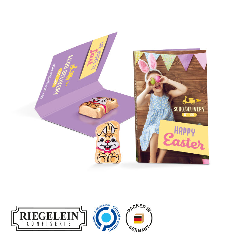 Schenk deinen Kund*Innen und Mitarbeiter*Innen einen Ostergruß mit der Werbekarte Osterhase. Der Gruß schmeckt sogar süß durch den Riegelein Edelvollmilch-Osterhasen und ist aus FSC-zertifiziertem Papier hergestellt. Damit kommt deine Werbebotschaft bis in den Magen.