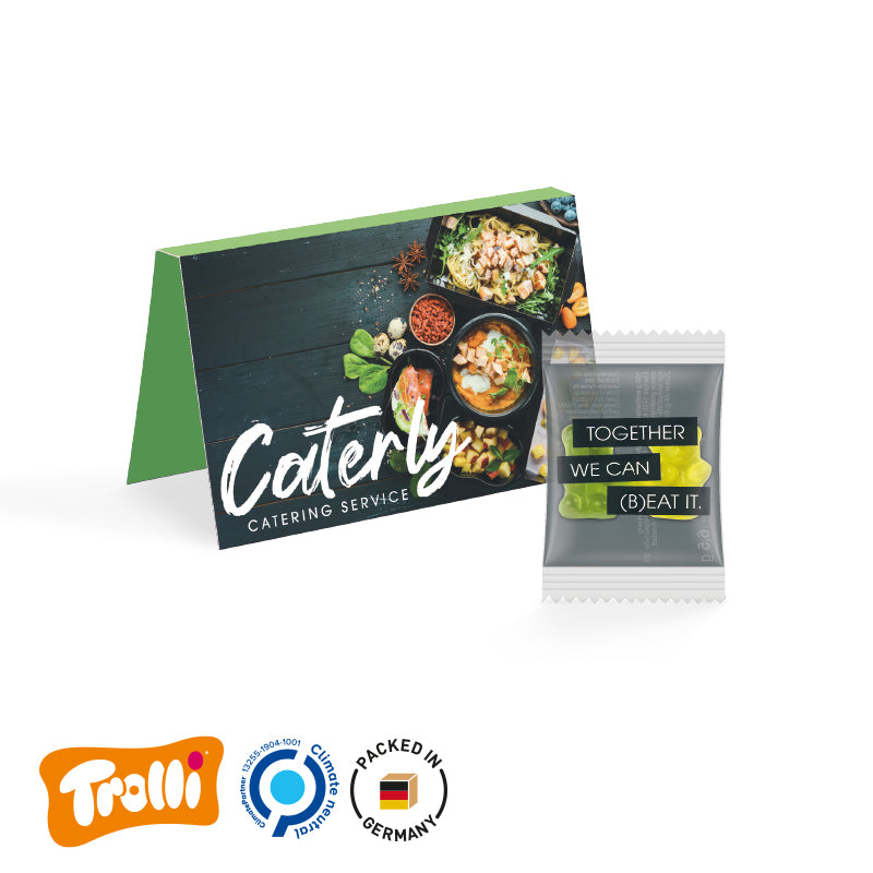 Die klimaneutrale Werbekarte mit Gummibärchen Team von der Trolli ist das perfekte Werbemittel für dein Unternehmen! Einfach sensationell ist die praktische Abreißperforation der Klappkarte mit FSC-zertifiziertem Karton. Ob als originelle Visitenkarte oder Rabattaktion am Point of Sale - hier sind Fantasie und Kreativität keine Grenzen gesetzt. Die Werbekarte mit Trolli Gummibärchen Team klimaneutral und individuell bedruckt.