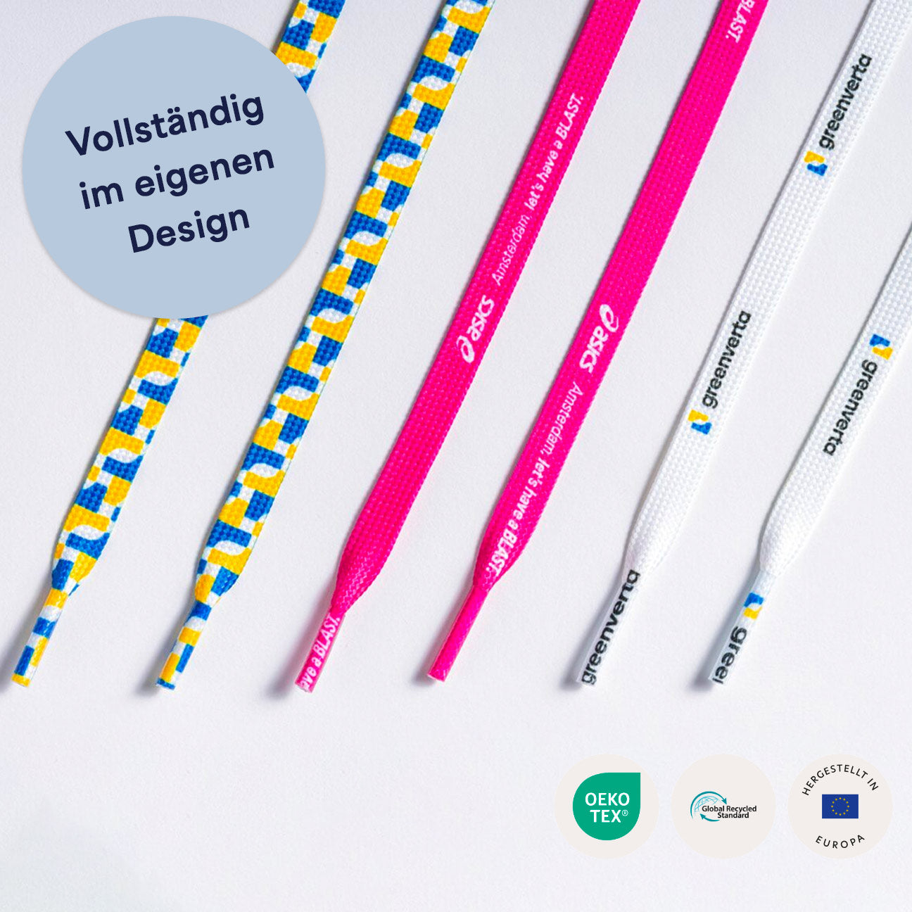 Unsere Schnürsenkel sind OEKO-Tex und GRS zertifiziert, was bedeutet, dass sie frei von schädlichen Substanzen sind und nachhaltige Herstellungsstandards erfüllen. Nutze die rPET Schnürsenkel als originelles Werbegeschenk oder als Teil Deiner Markenidentität, um einen bleibenden Eindruck zu hinterlassen.