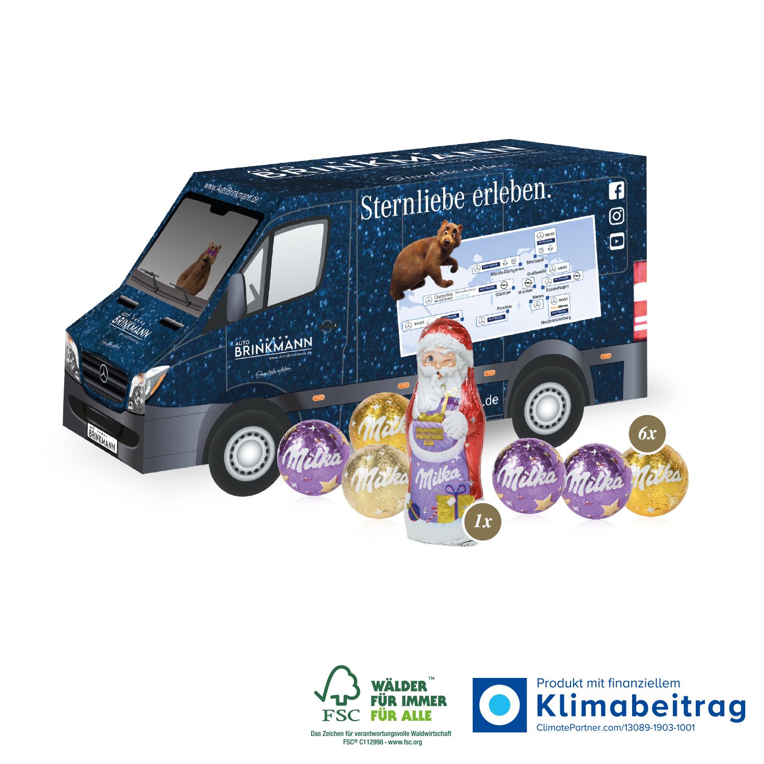 3D Präsent Transporter Milka Kugeln und Milka Weihnachtsmann im Überblick: