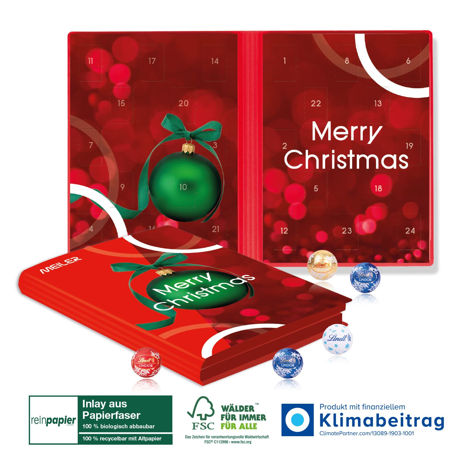 Hergestellt aus FSC®-zertifiziertem Karton, unterstützt dieser Adventskalender eine verantwortungsvolle Forstwirtschaft. Der 4c Digitaldruck sorgt dafür, dass das Design ansprechend und festlich wirkt.