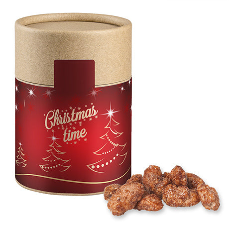 Das leckere Weihnachtsgeschenk in biologisch abbaubarer Eco Papierdose Midi – Gebrannte Mandeln 80g. Die Bio-zertifizierten Mandeln können in einer schwarzen oder braunen Eco Papierdose geliefert werden. Deine Werbebotschaft, Wunsch-Design oder Logo können rundum die Box platziert werden. Per Digitaldruck (4c) sind dir im Design eures Etiketts so gut wie keine Grenzen gesetzt. Die süßeste Aufmerksamkeit in der Weihnachtszeit für deine Kund:innen und Mitarbeiter:innen.