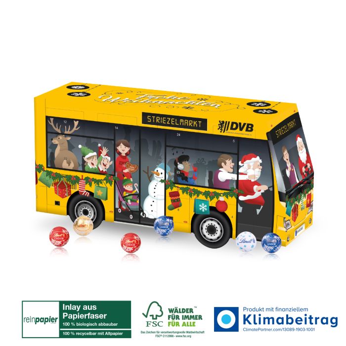 Der 3D Adventskalender Lindt „Bus“ Organic ist der perfekte, nachhaltige Begleiter, um süße Freude zu verschenken und weihnachtliche Stimmung zu verbreiten. Besonders geeignet für die Tourismusbranche, sorgt dieser Kalender für ein besonderes Highlight in der Adventszeit.