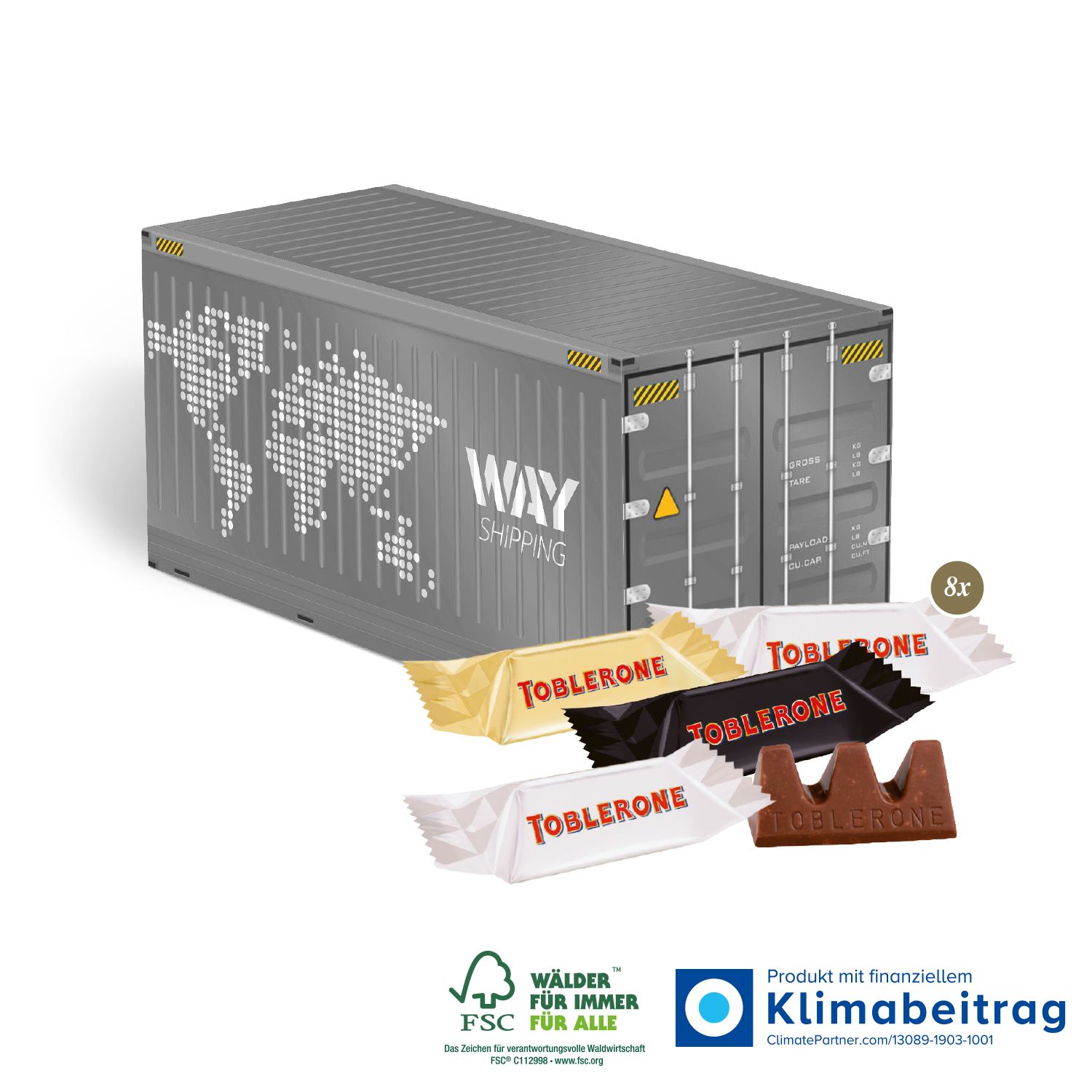 Das 3D Präsent in Form eines Containers ist ein nachhaltiger Adventskalender, der sich hervorragend für die Transport- und Logistikbranche eignet. Er enthält 8 Stück (ca. 64 g) Toblerone Minis, die in bunten Geschmacksrichtungen für genussvolle Momente sorgen.