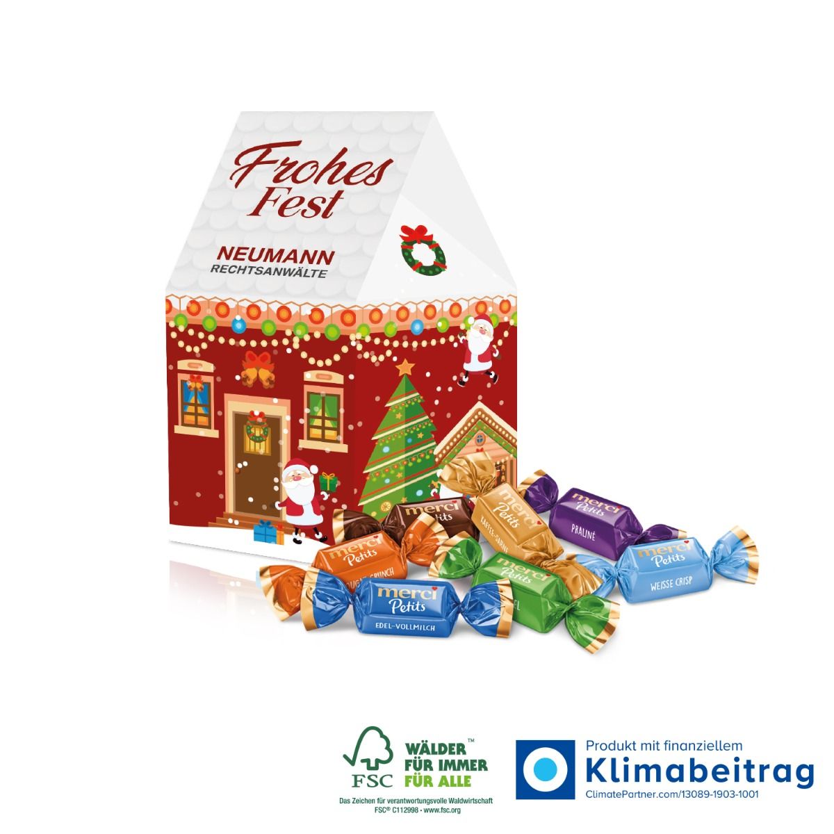 Das 3D Präsent in Form eines Hauses ist ein festlicher Adventskalender, der sich ideal als Geschenk für deine Mitarbeiterinnen oder Kundinnen eignet. Besonders passend ist es für die Immobilienbranche, wo es als originelles Präsent wirkt. Der Kalender enthält 10 Stück (ca. 58 g) einer köstlichen Schokoladenmischung von Merci, die in bunten Geschmacksrichtungen erhältlich ist, darunter Edel-Vollmilch, Mandel, Weiße Crisp, Dunkle Vollmilch, Cappuccino, Praline-Creme, Haselnuss-Creme und Crunch.