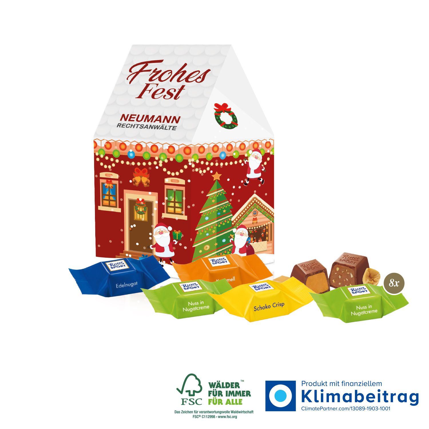 Das 3D Präsent in Form eines Hauses ist ein kreativer Adventskalender, perfekt für deine Mitarbeiterinnen oder Kundinnen und besonders geeignet für die Immobilienbranche. Die individuelle Präsentverpackung aus hochwertiger Kartonage beherbergt 8 Stück (ca. 64 g) bunte Ritter SPORT Schokowürfel, die für süße Genussmomente sorgen.
