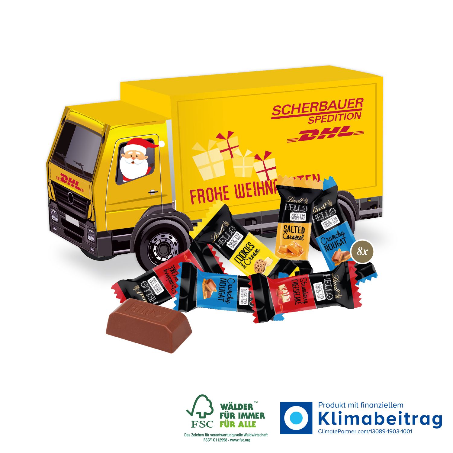 Mit hochwertigem 4c Euroskala Druck wird der 3D Präsent LKW mit Lindt HELLO Mini Stick Mix zu einem einzigartigen und ansprechenden Geschenk, das nicht nur den Gaumen erfreut, sondern auch für einen nachhaltigen Eindruck sorgt. Verleihe der Weihnachtszeit eine süße Note und zeige deinen Kunden und Mitarbeiter, dass du an sie denkst!