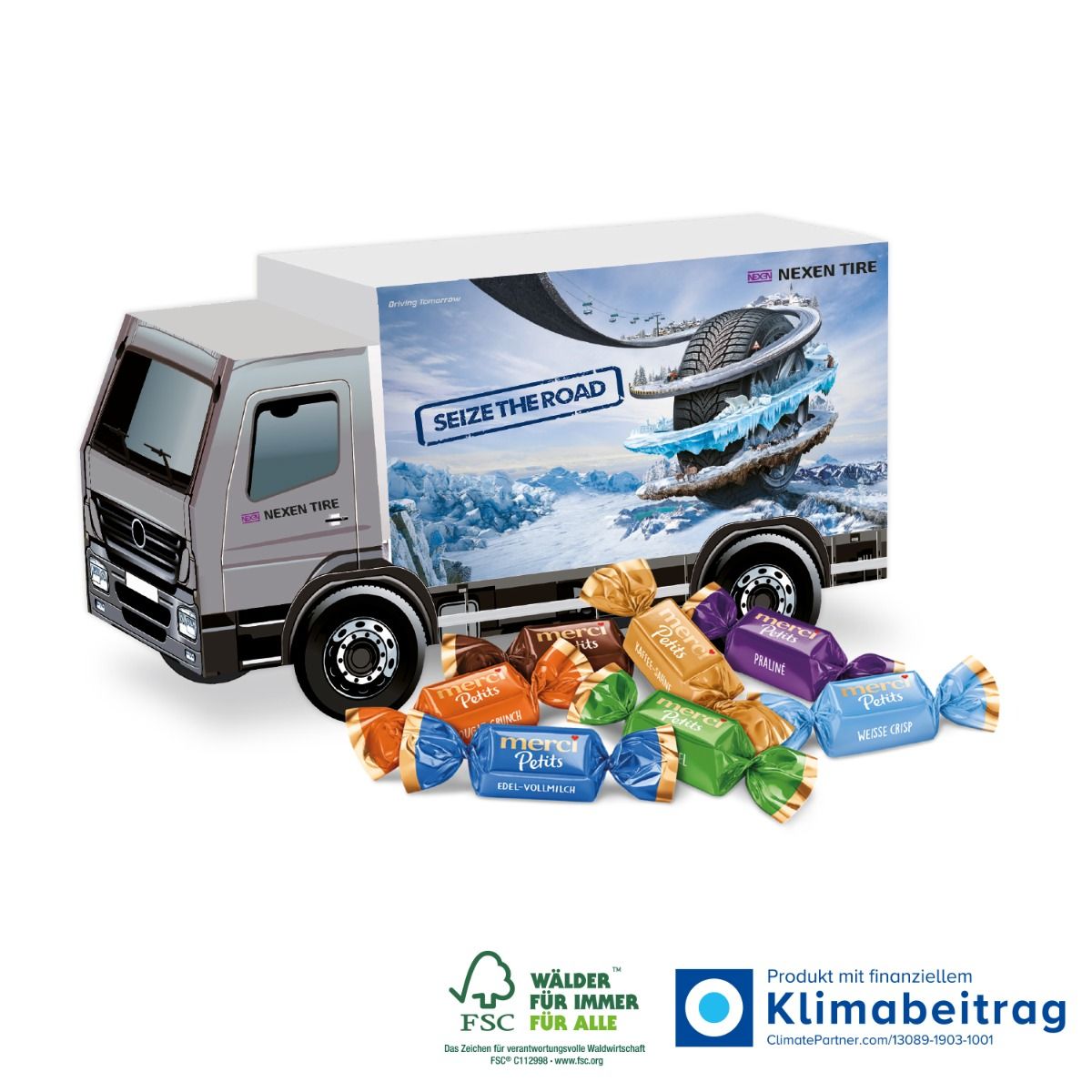 Der 3D Präsent LKW mit Merci ist der ideale Adventskalender für alle Schokoladenliebhaber! Dieser einzigartige Adventskalender ist in Form eines charmanten LKWs gestaltet und bringt mit 10 köstlichen Merci-Schokoladensorten (ca. 58 g) himmlische Genussmomente direkt zu dir nach Hause. Die bunte Mischung umfasst edle Geschmacksrichtungen wie Edel-Vollmilch, Mandel, Weiße Crisp, Dunkle Vollmilch, Cappuccino, Praline-Creme, Haselnuss-Creme und Crunch – perfekt für jeden Geschmack!