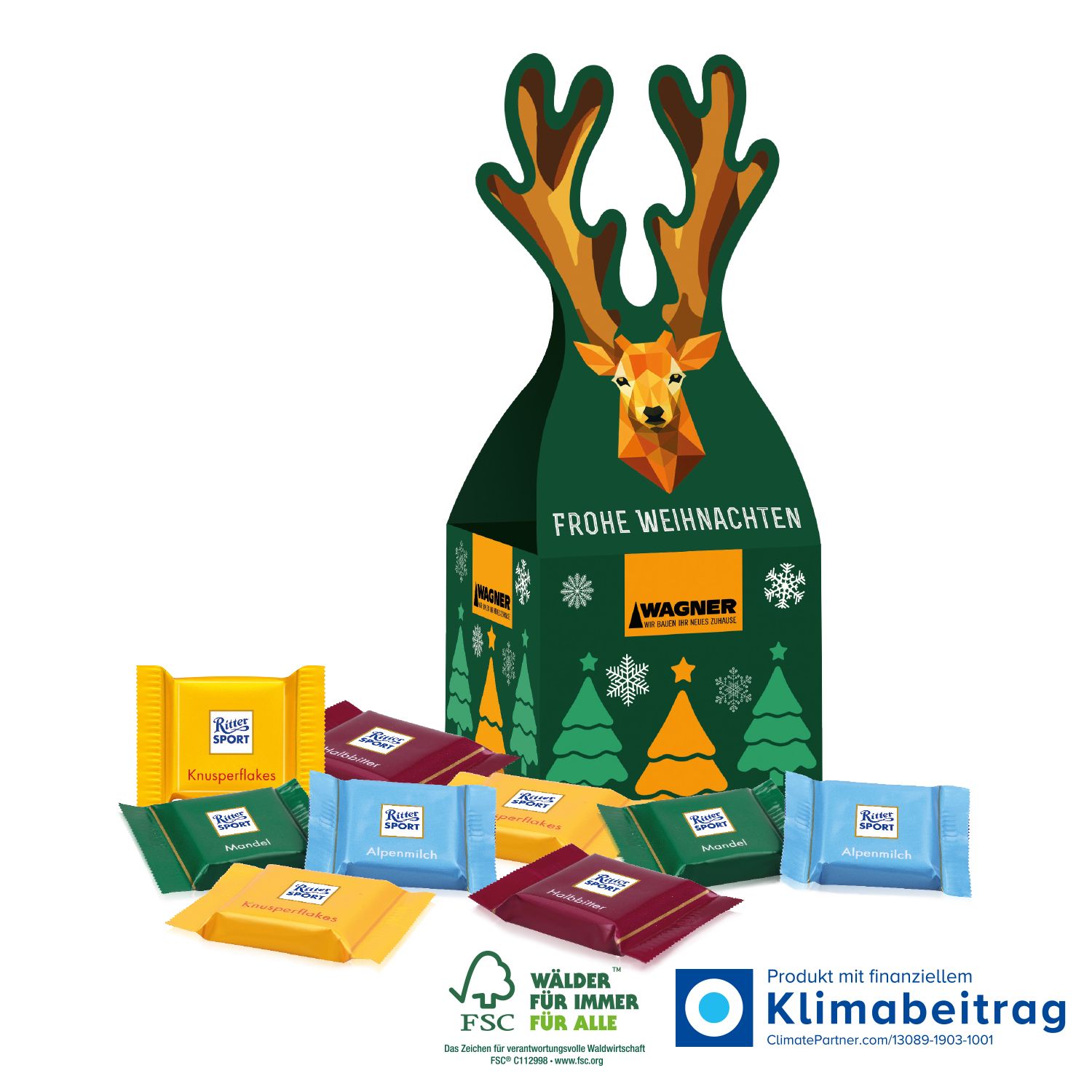Das 3D Präsent „Rentier“ mit Ritter SPORT Schokotäfelchen ist ein originelles und kreatives Weihnachtsgeschenk, das sich perfekt als festliches Werbegeschenk für deine Kundinnen oder Mitarbeiterinnen eignet.