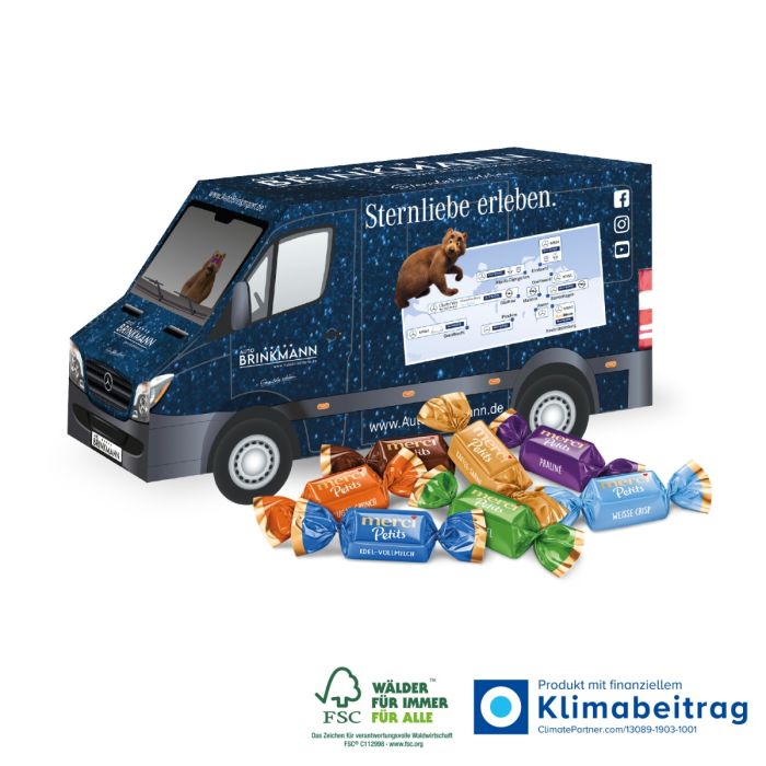 Der 3D Präsent Transporter Merci ist ein kreativer Adventskalender in Form eines Transporters, der nicht nur für die Vorfreude auf die Weihnachtszeit sorgt, sondern auch individuell in deinem Firmendesign bedruckbar ist.