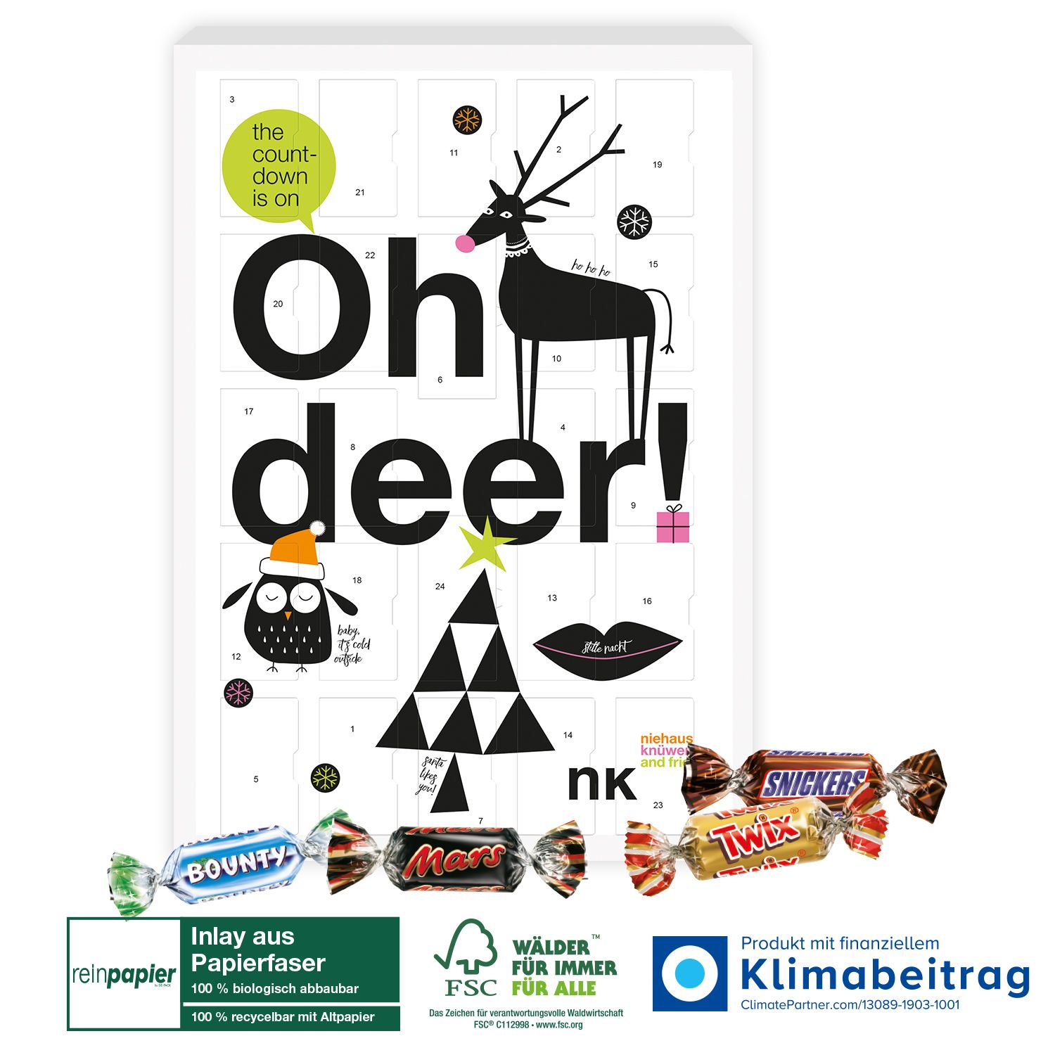 Hergestellt aus FSC®-zertifiziertem Karton und verziert mit einem ansprechenden 4c Digitaldruck, eignet sich der Adventskalender perfekt als persönliches Geschenk für Deine KundInnen oder MitarbeiterInnen. Optional kannst Du einen Einzelversandkarton für den Postversand hinzubestellen, um die süßen Überraschungen bequem zu verschicken. Mach die Vorweihnachtszeit unvergesslich mit dem Mars Mix!